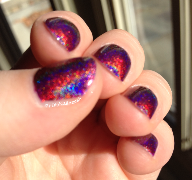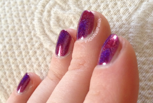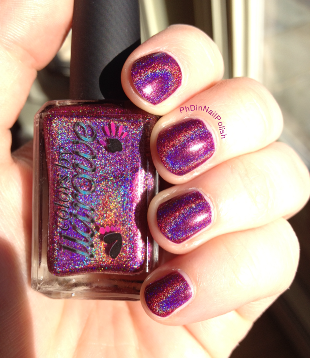 This polish is described by Llarowe as a “magenta holo”, which doesn’t even begin to describe its awesomeness. The holo in this polish is extremely strong (and extremely distracting). It’s totally dazzling in the sunlight. You’ll have to wear sunglasses like Scott Summers/Cyclops in X-Men, it’s so bright. Look at that holo rainbow goodness: