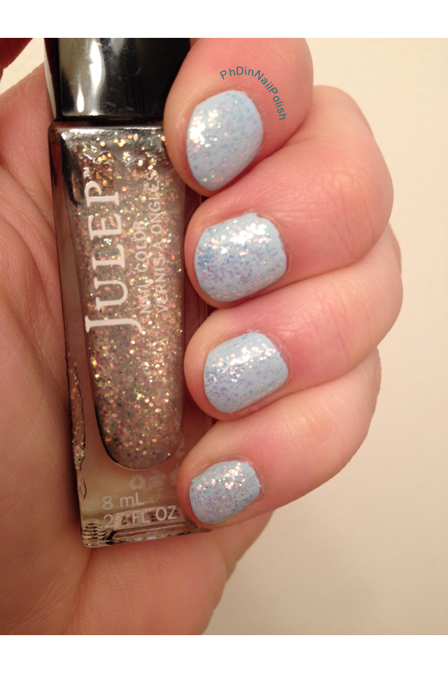 I used Zoya “Blu” underneath Julep “Camille”. Blu is a very light blue creme shade and Camille has small iridescent glitters in a clear base. I adored how the glittery top coat looked, but I have to say that the Zoya polish underneath was a real problem. First, the stuff went on like white-out, thick and chalky. Worse, it didn’t cover well, refused to level out, and dried very slowly. I ended up having to use three coats, and it felt very thick on my nails. The polish on my thumb squished off an hour after I finished, which I was displeased with.