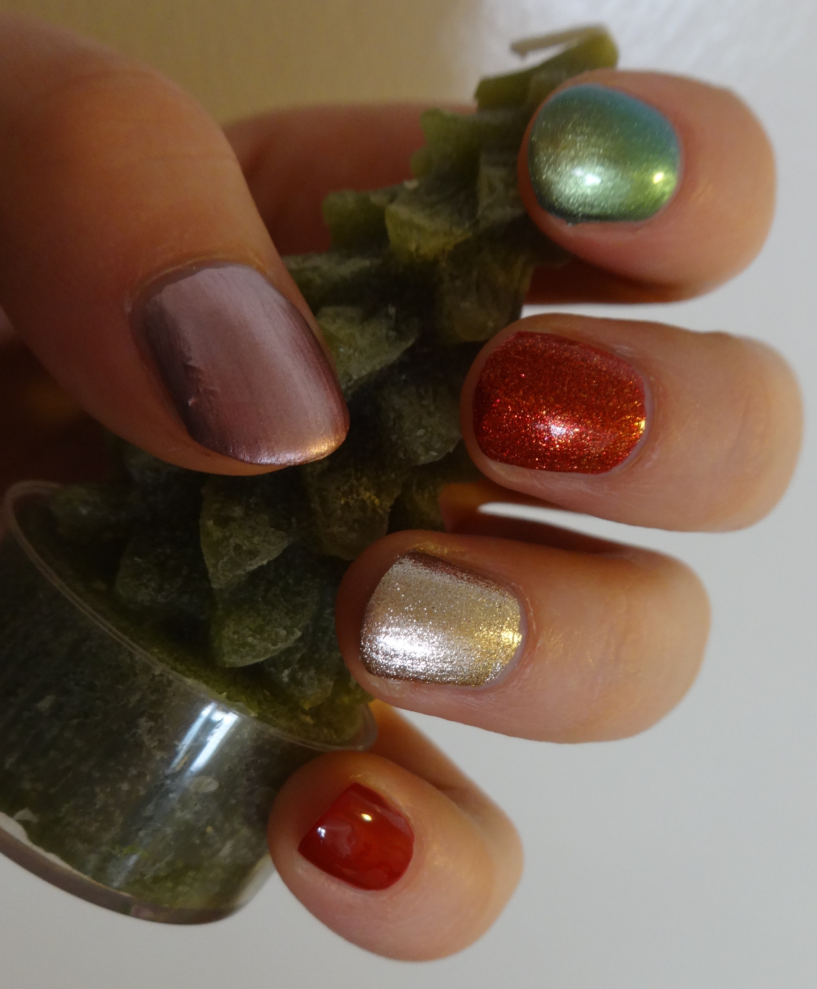 Third down: Julep “Zelda”. Shiny foily finish that’s really forgiving to work with. The color is like silver with a rose gold infusion. While the color might be close to a neutral, the finish takes it that extra step to being holiday-party worthy. Amazing one-coater opacity.