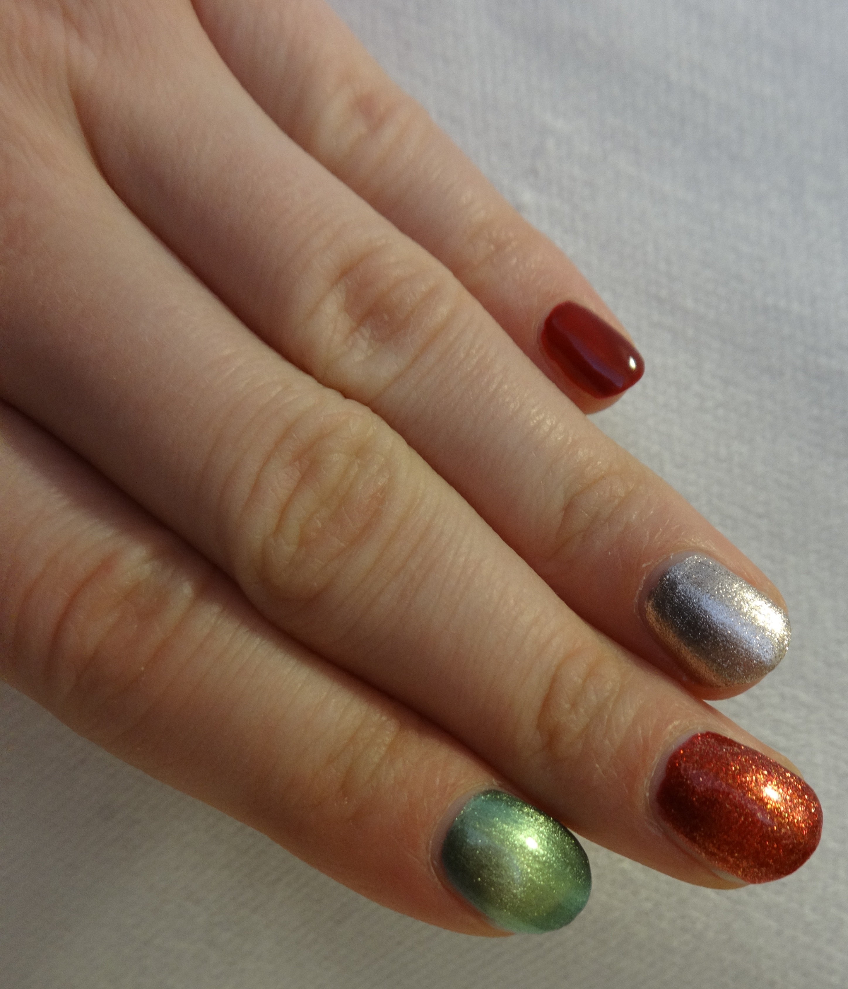 Bottom: Essie “A-list”. Everybody needs a nice go-to red for the holidays. This is my go-to red for whenever. A nice need red creme with a hint of crelly, so it has nice depth. Two coats here.