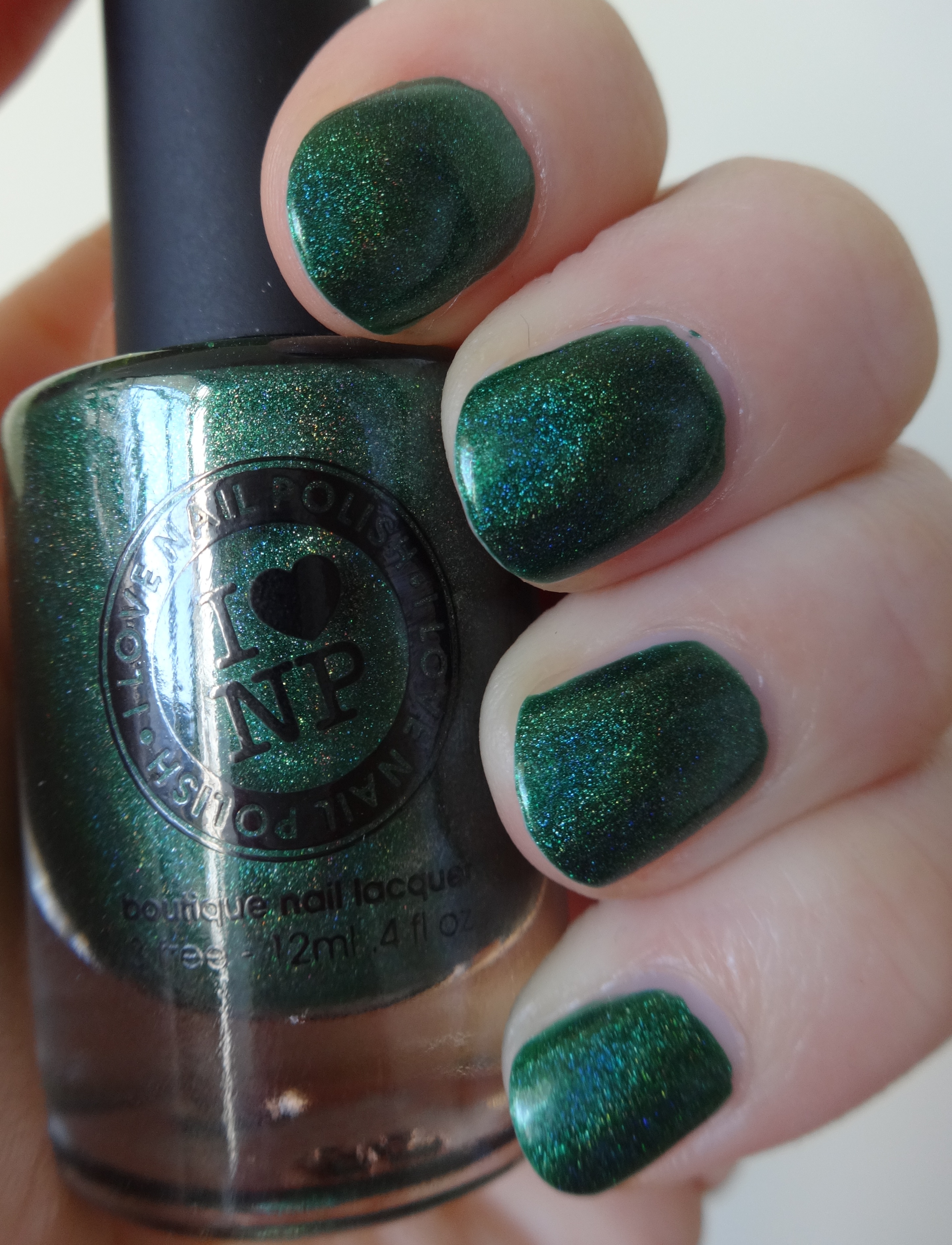 I Love Nail Polish is a brand that I’ve recently discovered and am now completely obsessed with. I was totally drawn in by their holiday mini-collection, which included “Nostalgia”, a red-green color shifter, “Very Ornamental”, a red holo, and “A Fresh Evergreen”, a green holo. Since I am on a never-ending quest to find the perfect green, I snatched up “Evergreen” on pre-order and put it on the moment it came in the mail. (Side note: I Love Nail Polish has the absolute cutest packaging I’ve ever seen- pretty branded box and adorable branded tissue paper.)