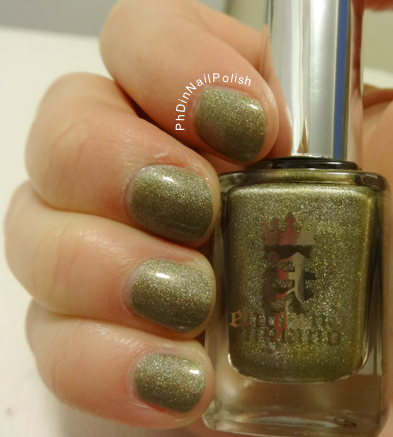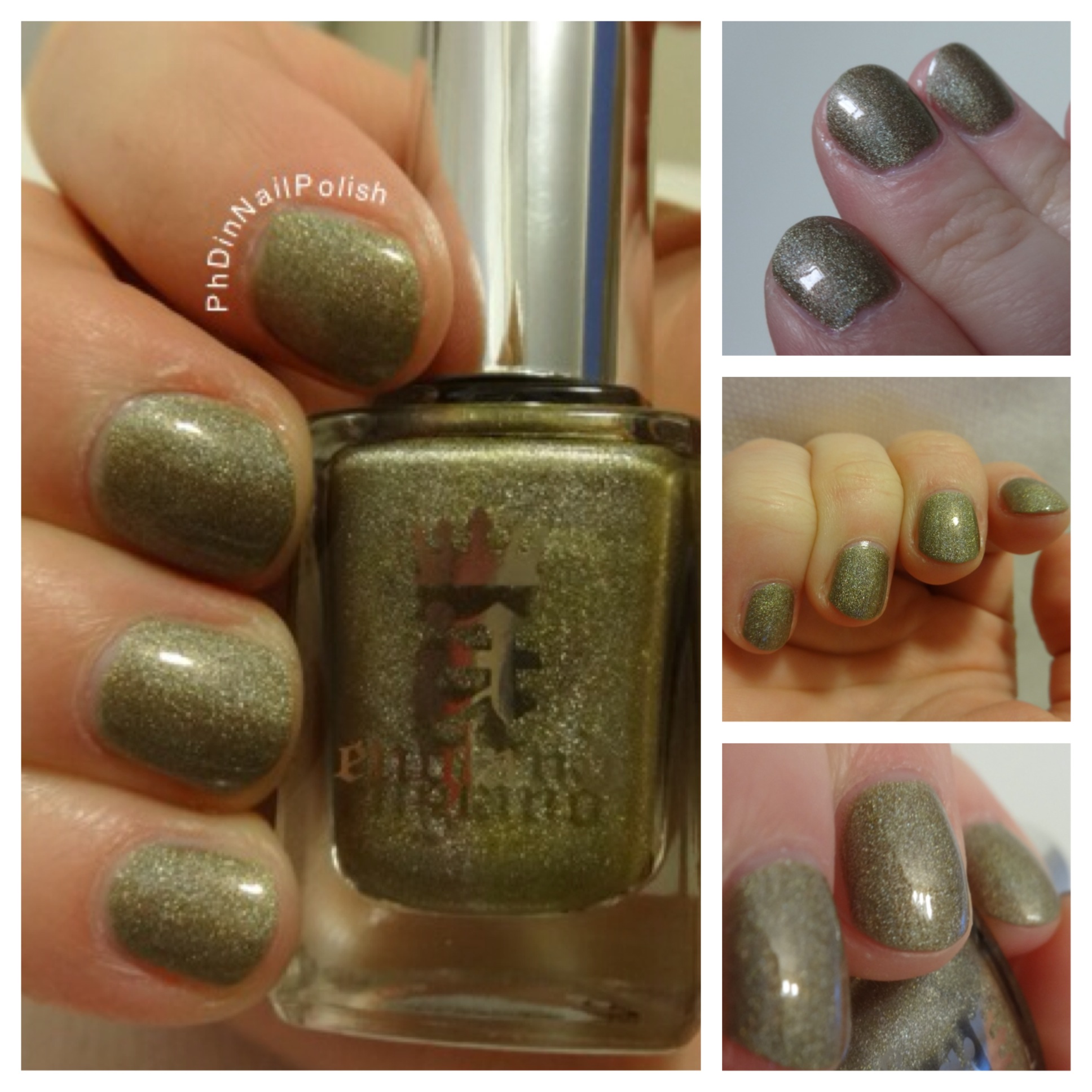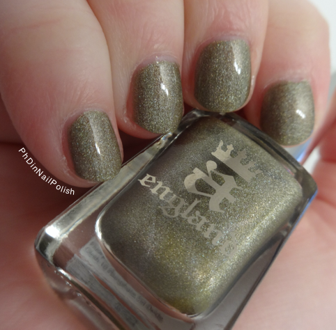 Confession: generally, I want ALL the A Englands, especially the holos. So, when I went on a search for a gold-ish holo for the times when my nails need something not brightly colored, I immediately snatched up Princess Sabra (Tristam Eyes) from the Legends Collection. It is a lovely light brownish-beige color that is probably appropriate for all occasions. Unfortunately for me, I just can’t seem to get the holo to come out (sad face). Maybe I should retire this polish until the summer, when it is sunny all the time, but for the winter, this is more of a semi-sparkly neutral (the sparkle is the same dimensional effect as a textured polish with topcoat, to give you an idea).