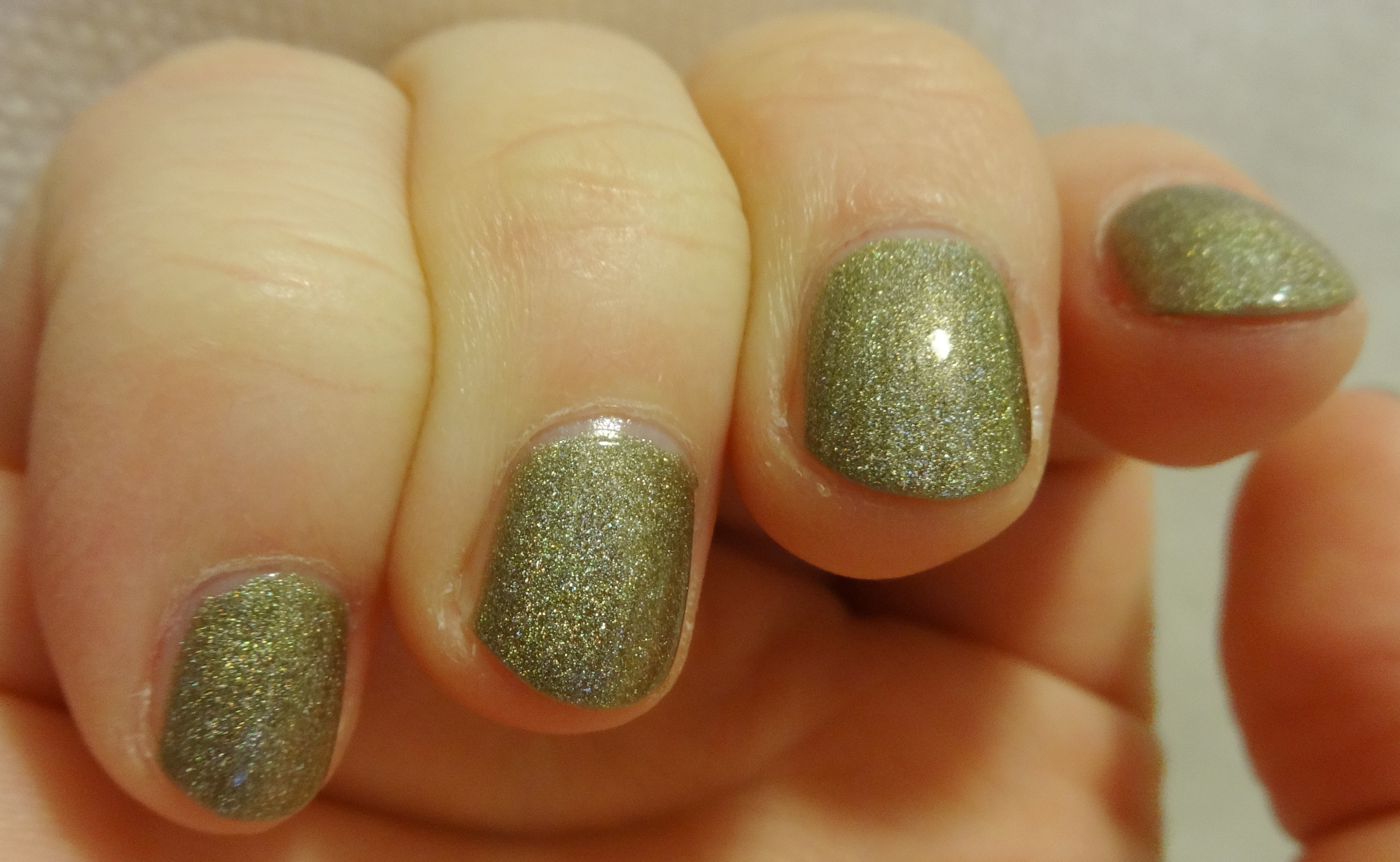 Now, my disappointment with its holo-ness aside, the formula on this is great. I did two thin coats here, but if you have longer nails, you might want to go with three thin coats. The wear time is great- I wore if for about a week while vacationing and was very hard on my nails, and it suffered only a single minor chip (from suitcase wrangling). It dries fast, and a little bit satin, so you’ll want a topcoat to make it shiny. I’ve used Glisten and Glow HK Girl.