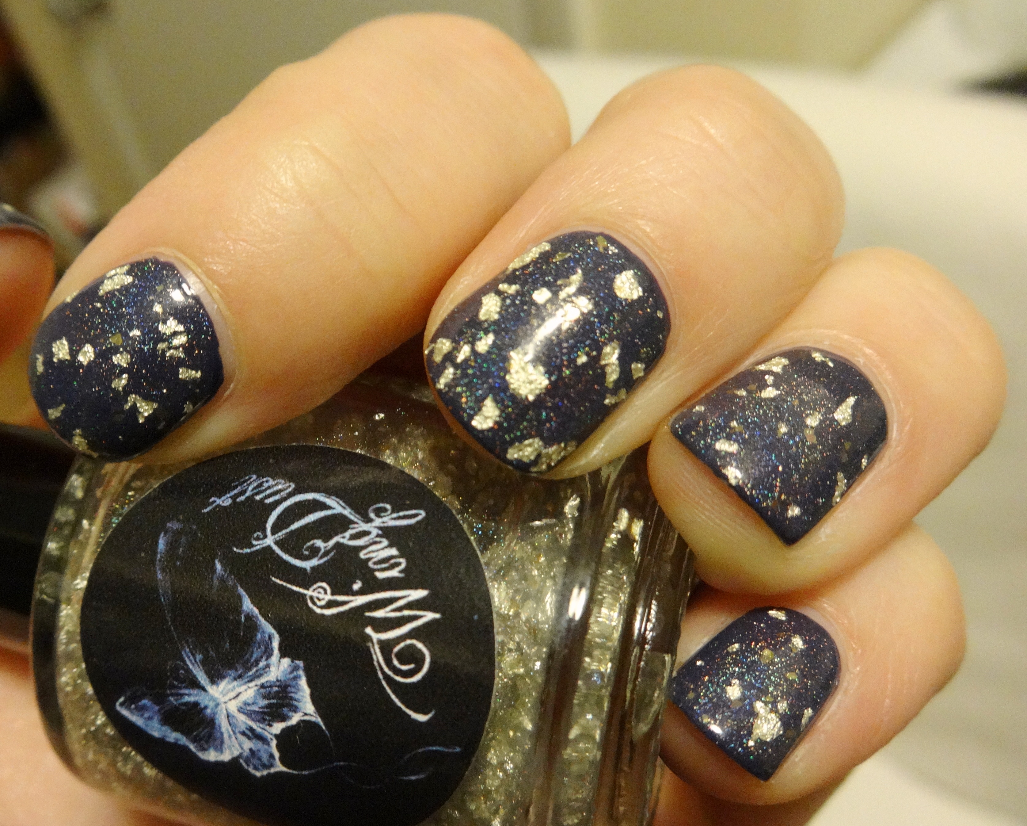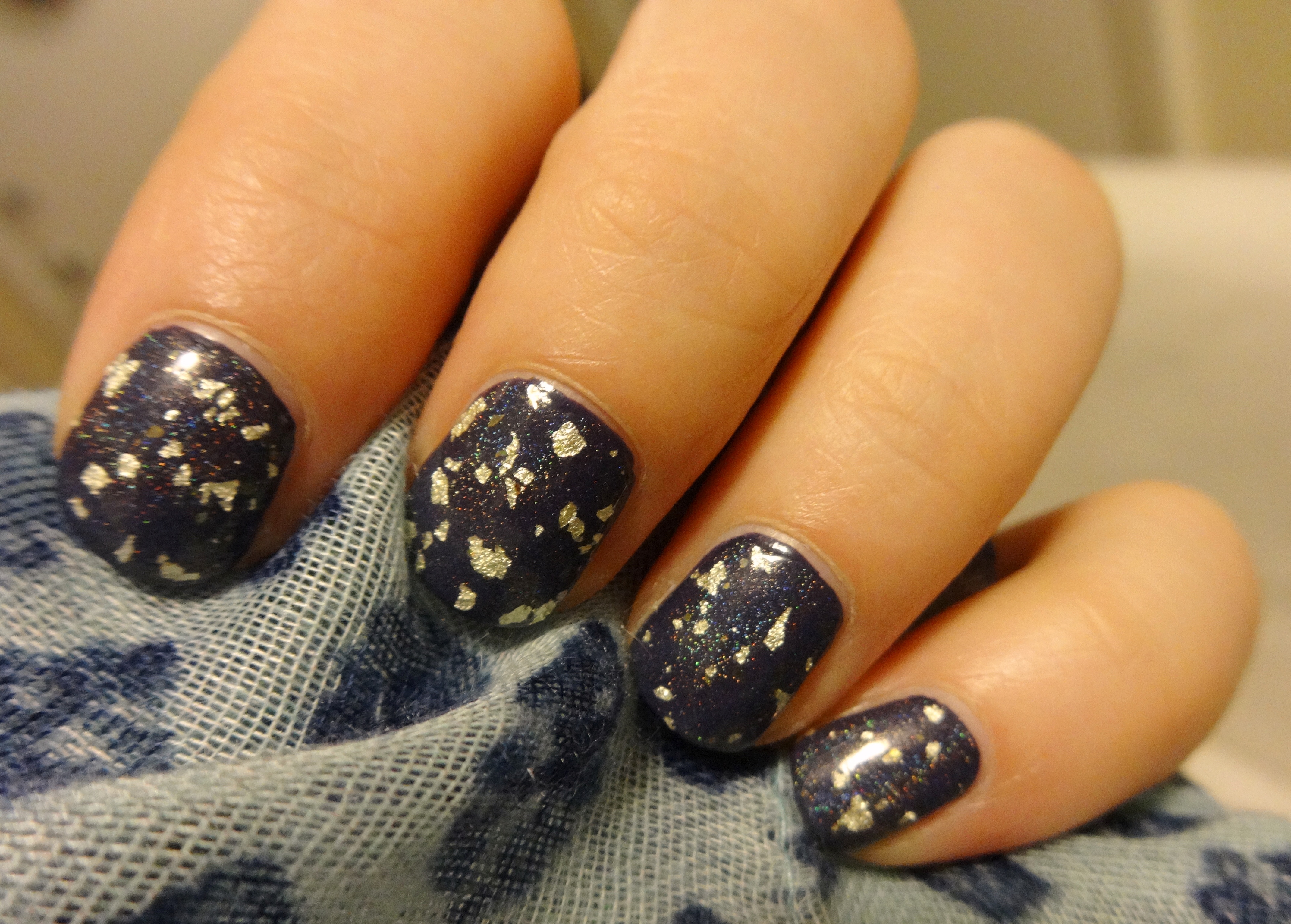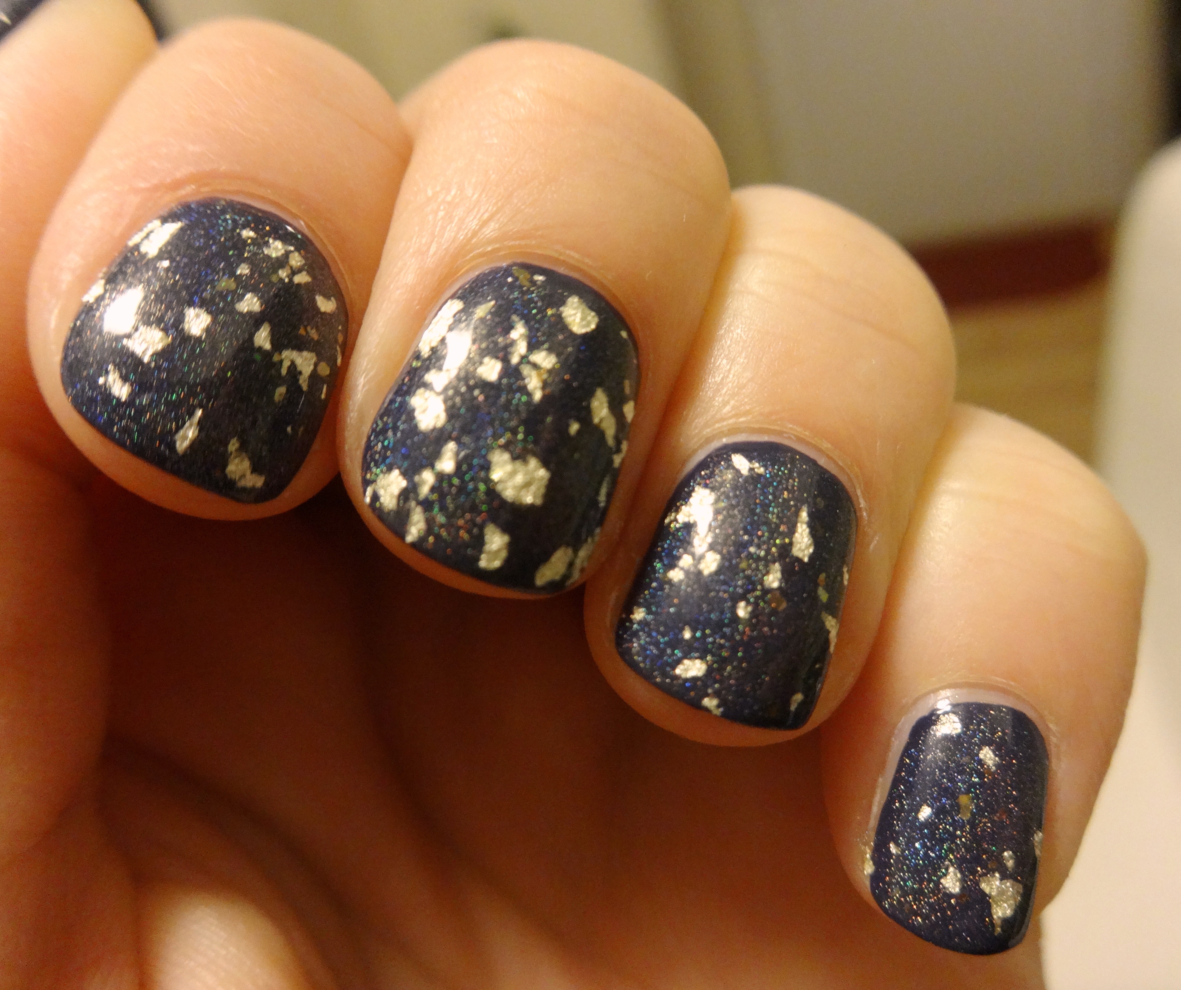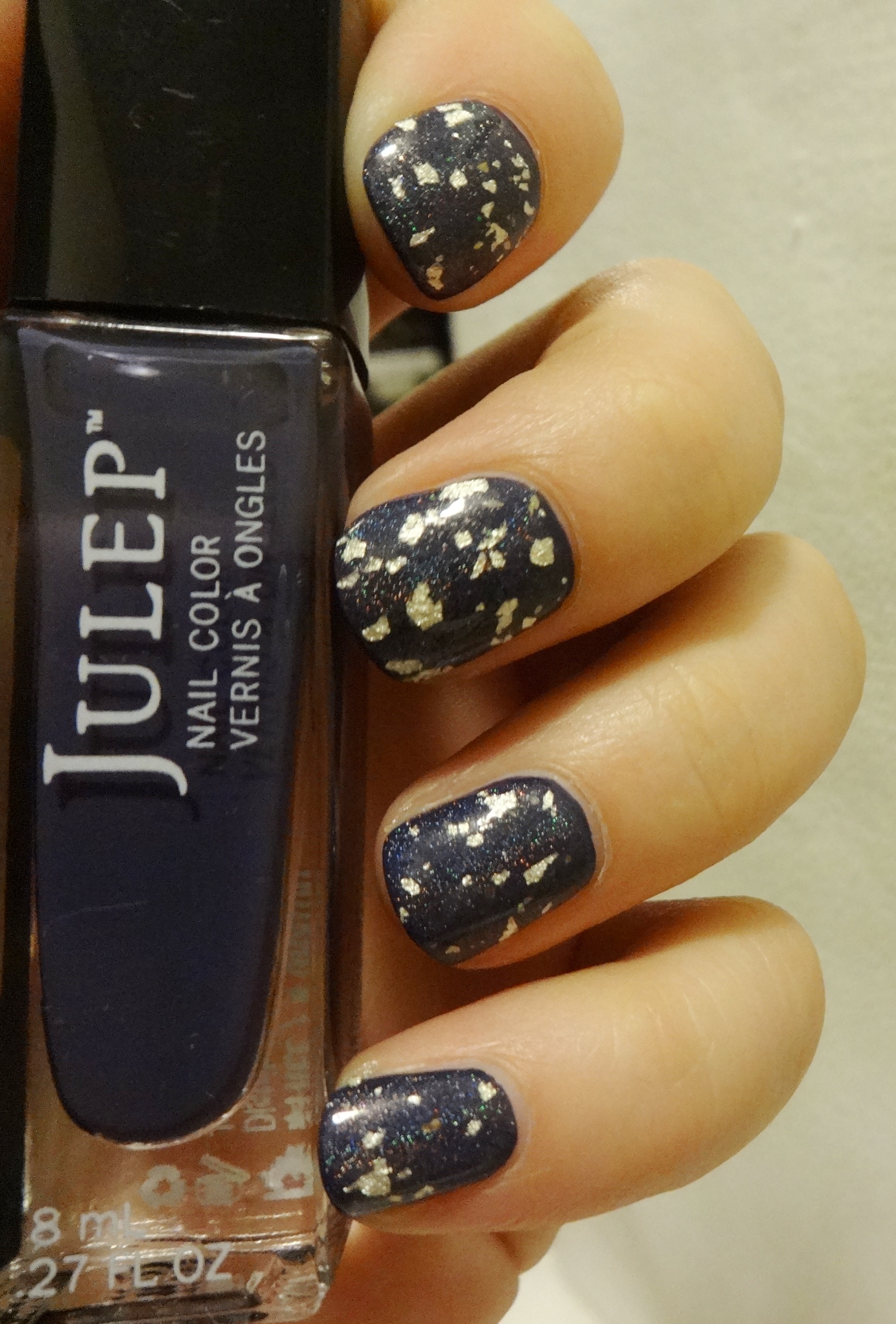 What you’re looking at is one coat of “I Can See Your Holo” over two coats of Julep Millie, a navy creme. It is a little difficult to tell in the pictures, but the holo particles in the topper do lighten up the color of the base a bit. I tried this over a lighter base, but I think it looks best over a darker color (so as to really showcase the holo). I was trying to avoid layering over black, but at any rate, it’s hard to tel there’s navy underneath anyways. For a top coat with a lot going on, it is very easy to work with- the white gold flakes seem to go on pretty evenly with no dabbing or fishing around necessary. All of the pictures here are without any other topcoat, so you can see that it is nice and shiny (and smooth) on its own.