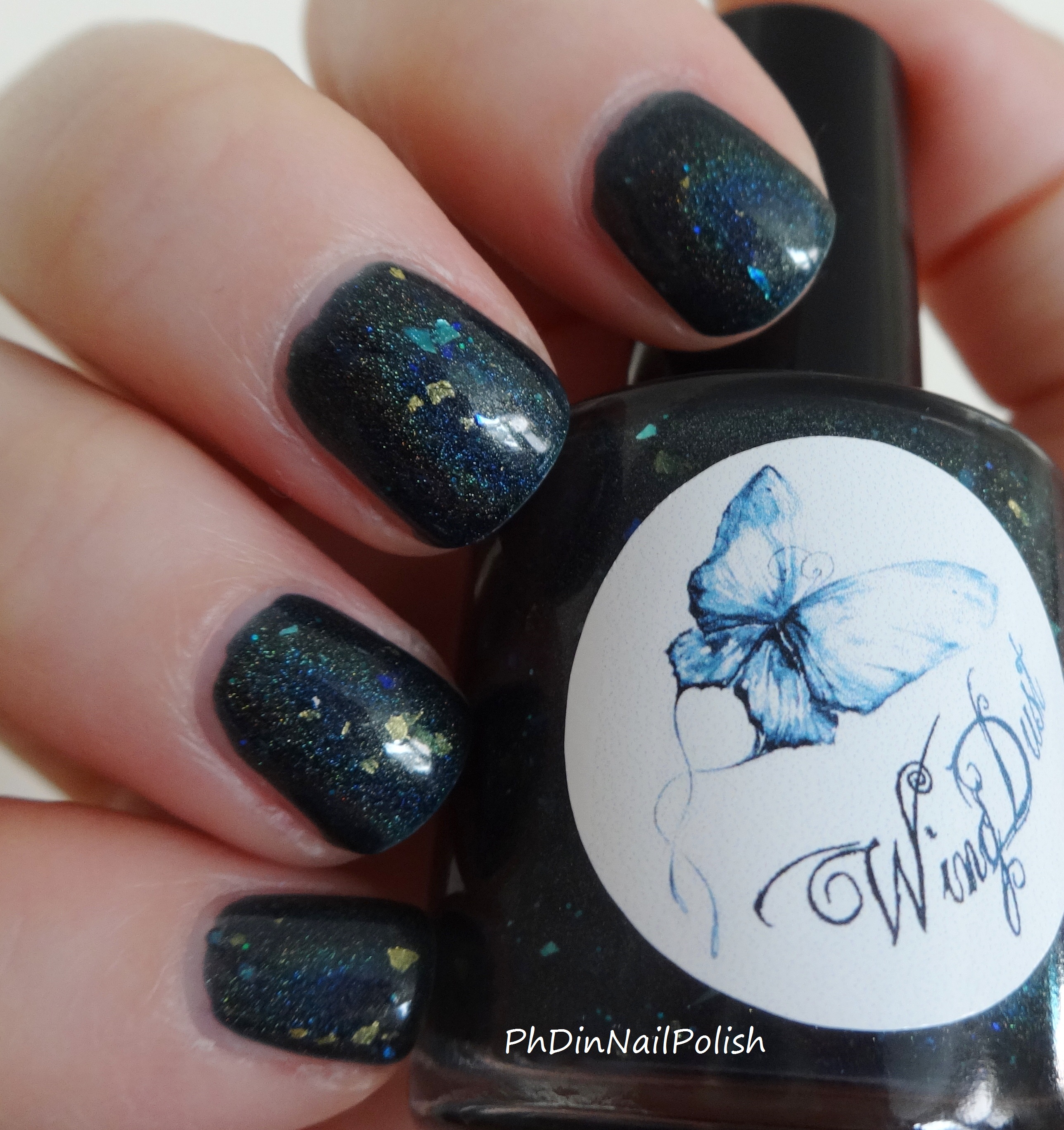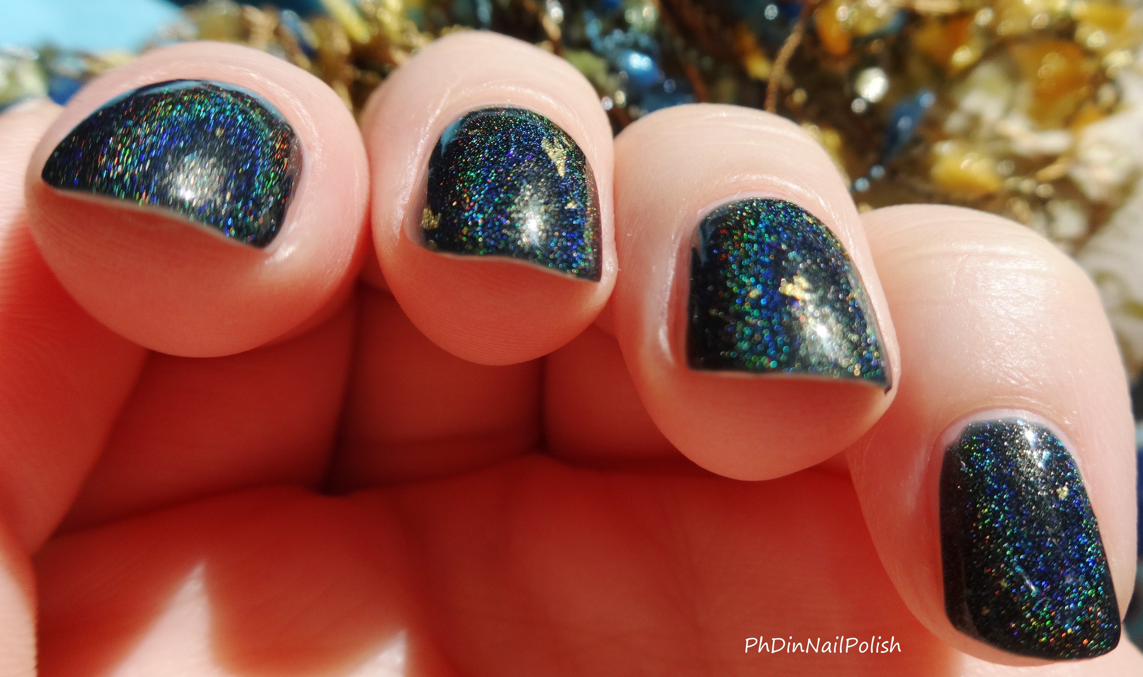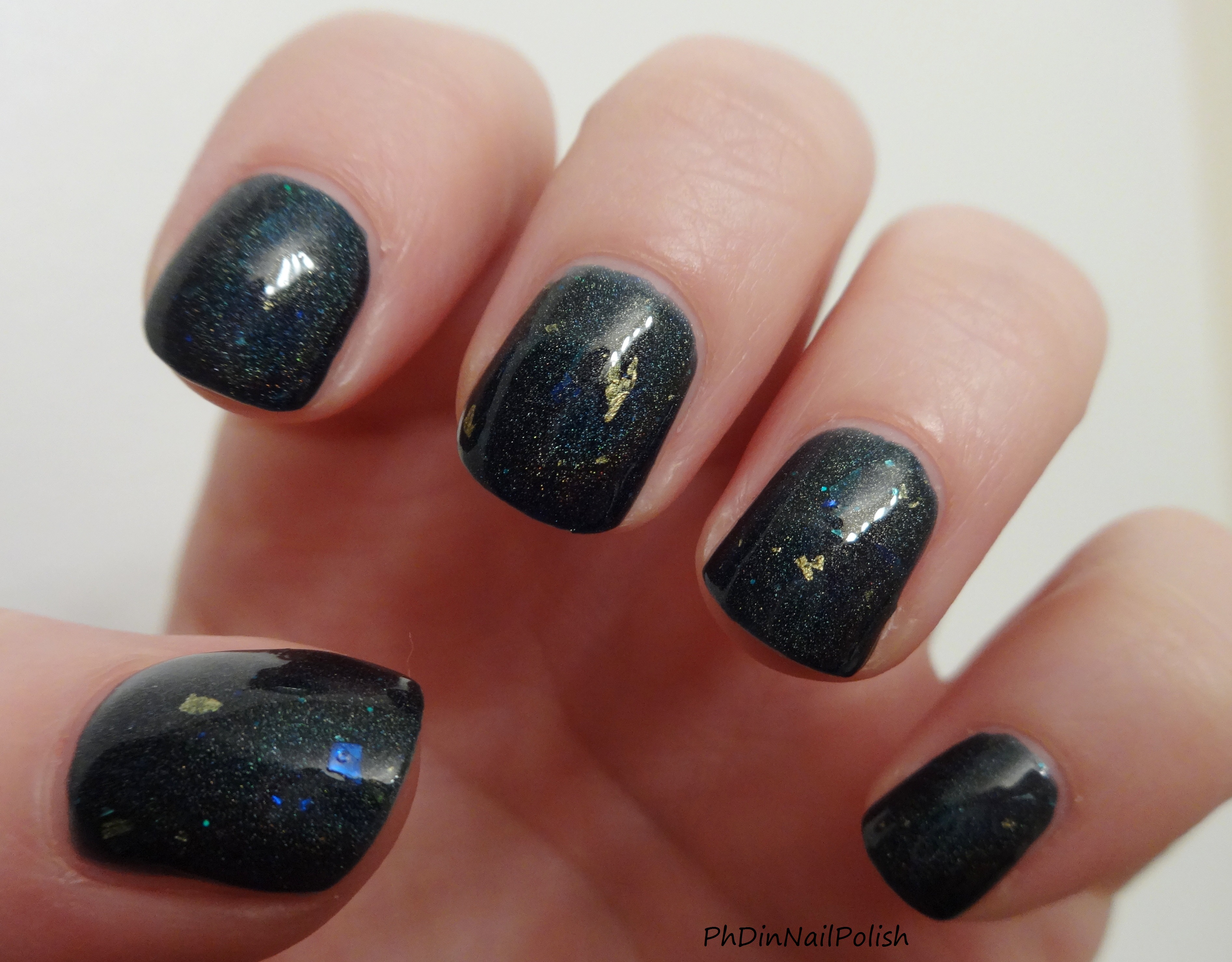 I saw this polish about a year ago, and it’s been a huge lemming ever since. I love that it has a combination of a ton of things- holo, gold flakes, iridescent shards, the whole shebang. So when I finally caught it in a restock in November, I was super excited. Now I’ve finally got it on the blog!