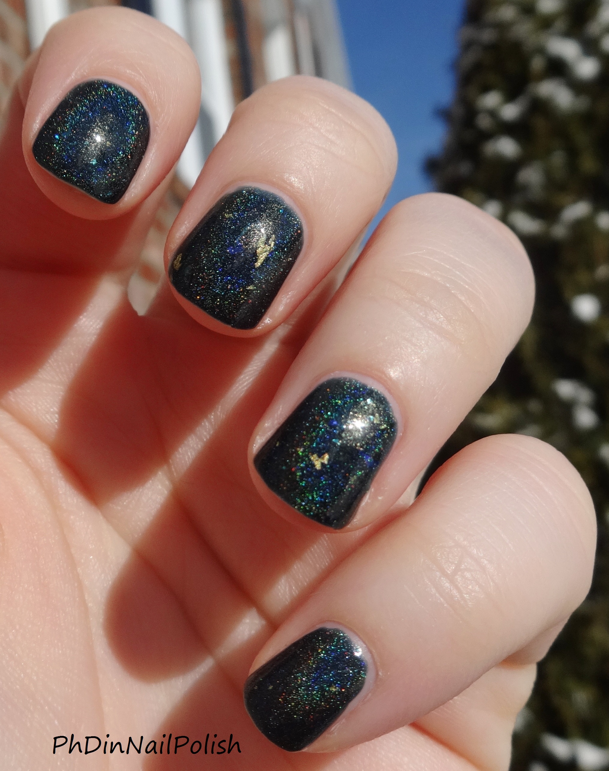 The holo in this is so strong, both indoors and outdoors (and the sun came out briefly just so I could photograph it)! I feel like the shards and flakes went on fairly evenly and smoothly. So smoooooth.