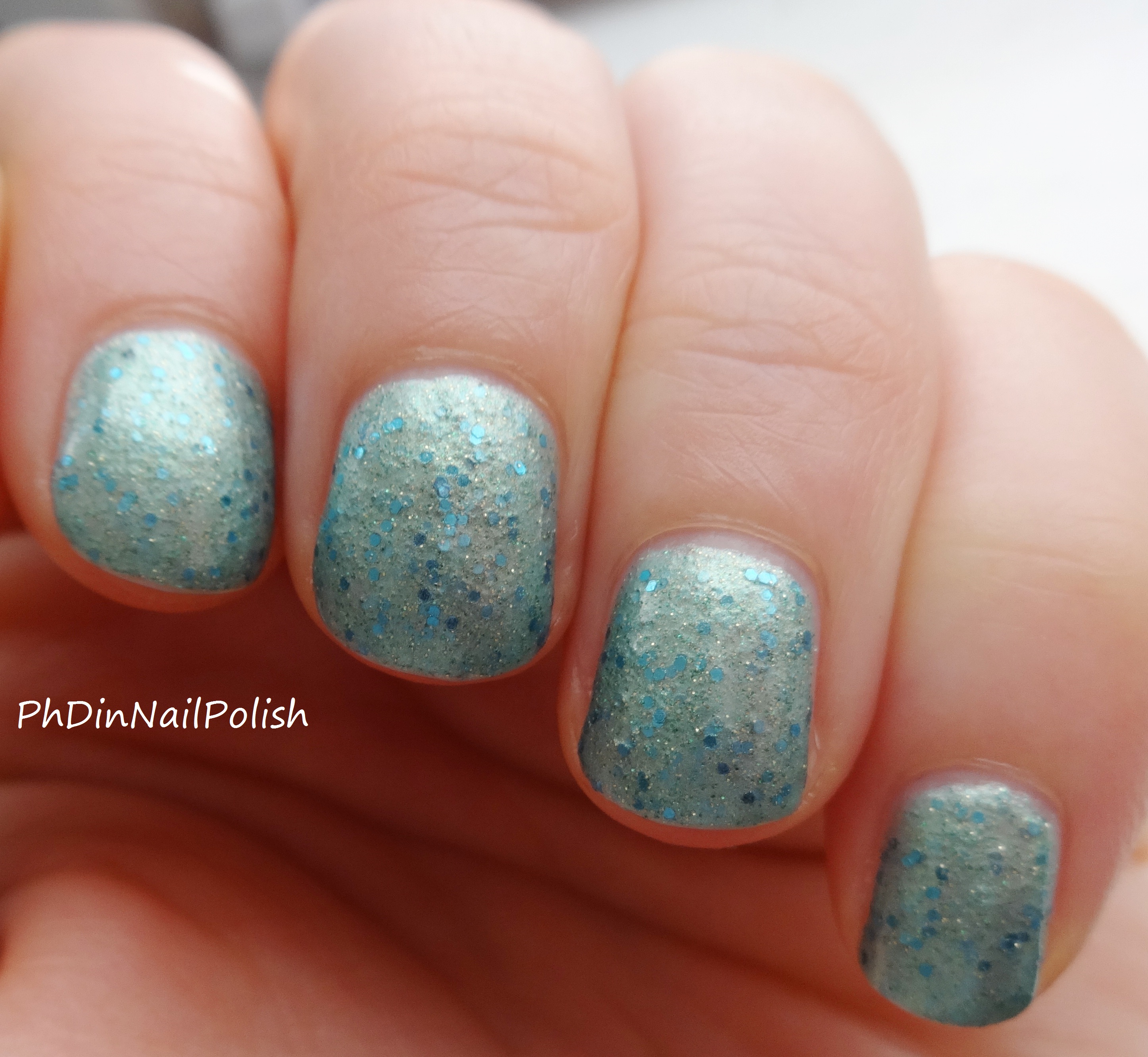 Revlon wintermintThis is three coats, with one layer of top coat. This was a bit of a topcoat eater, and even with one layer, it ended up being a bit textured and gritty. If this bugs you (it bugs me), or you really like that glassy look, you’re going to have to sacrifice some extra top coat to this polish.