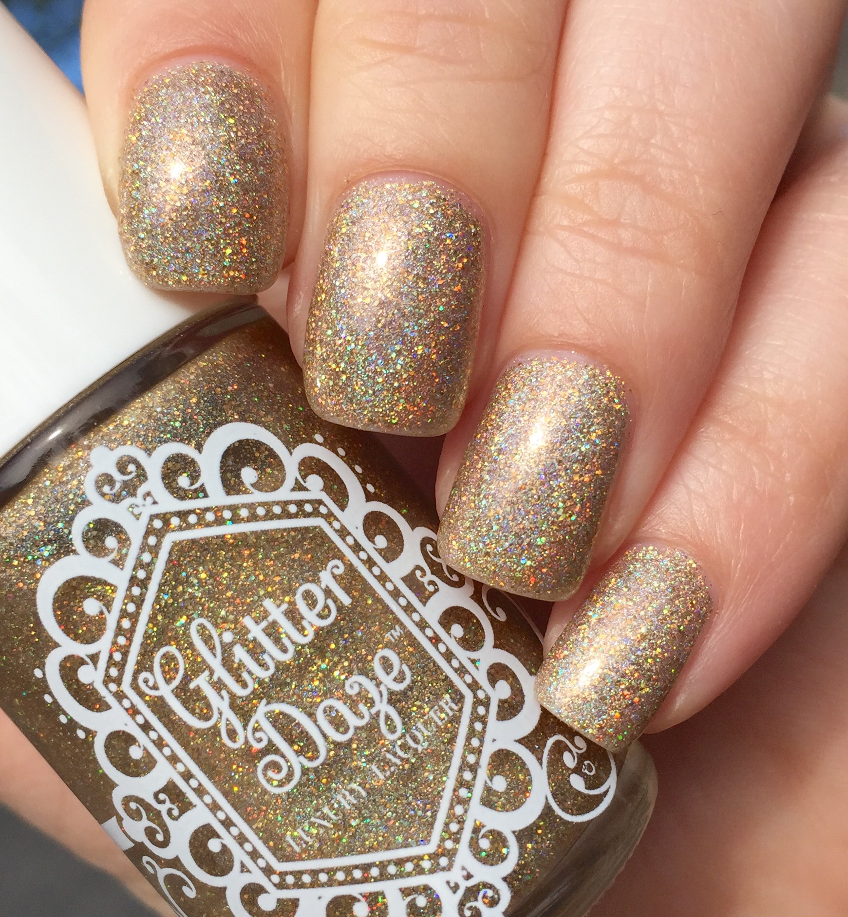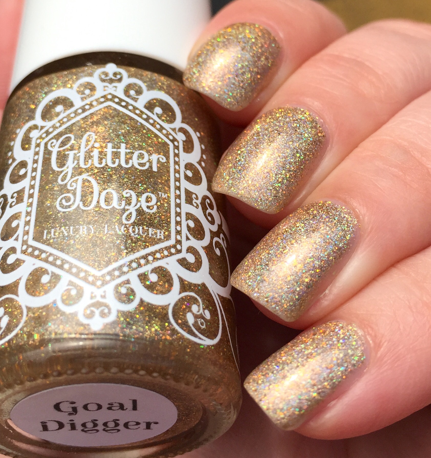 Do you ever have that one polish color or finish that you absolutely can’t resist? For me, there’s just something inexplicable about gold holos. Even though I know deep down that they’re not all going to flatter my super pale skin tone (I’m looking at you, AEngland “Tristam’s Eyes”), I am always drawn to them in new collections. And now that holos with flakies are a thing, I’m in total polish heaven (I’m still trying to find backup of my beloved Jade “Irresistivel”). So when this beauty from Glitter Daze arrived on my doorstep, you can imagine my glee. This is “Goal Digger,” a cool-tone gold holo with big silvery holo particles and gold microshimmer. Perfection. I won this gorgeous polish in a #NailGlossip giveaway, and I feel like I won the lottery. It is amazing. Thank you!