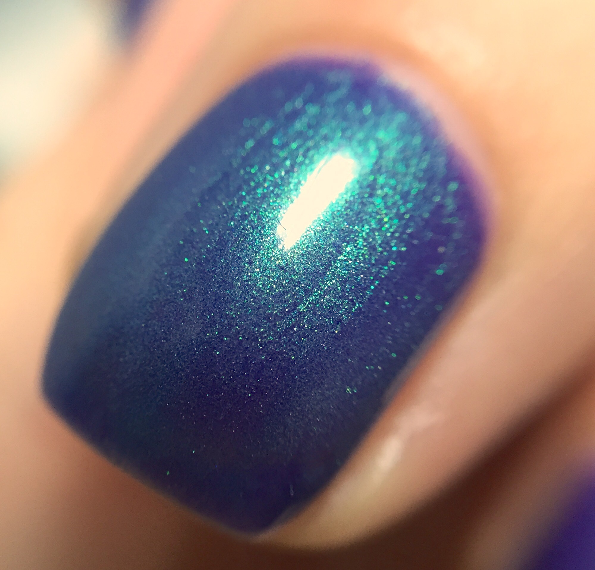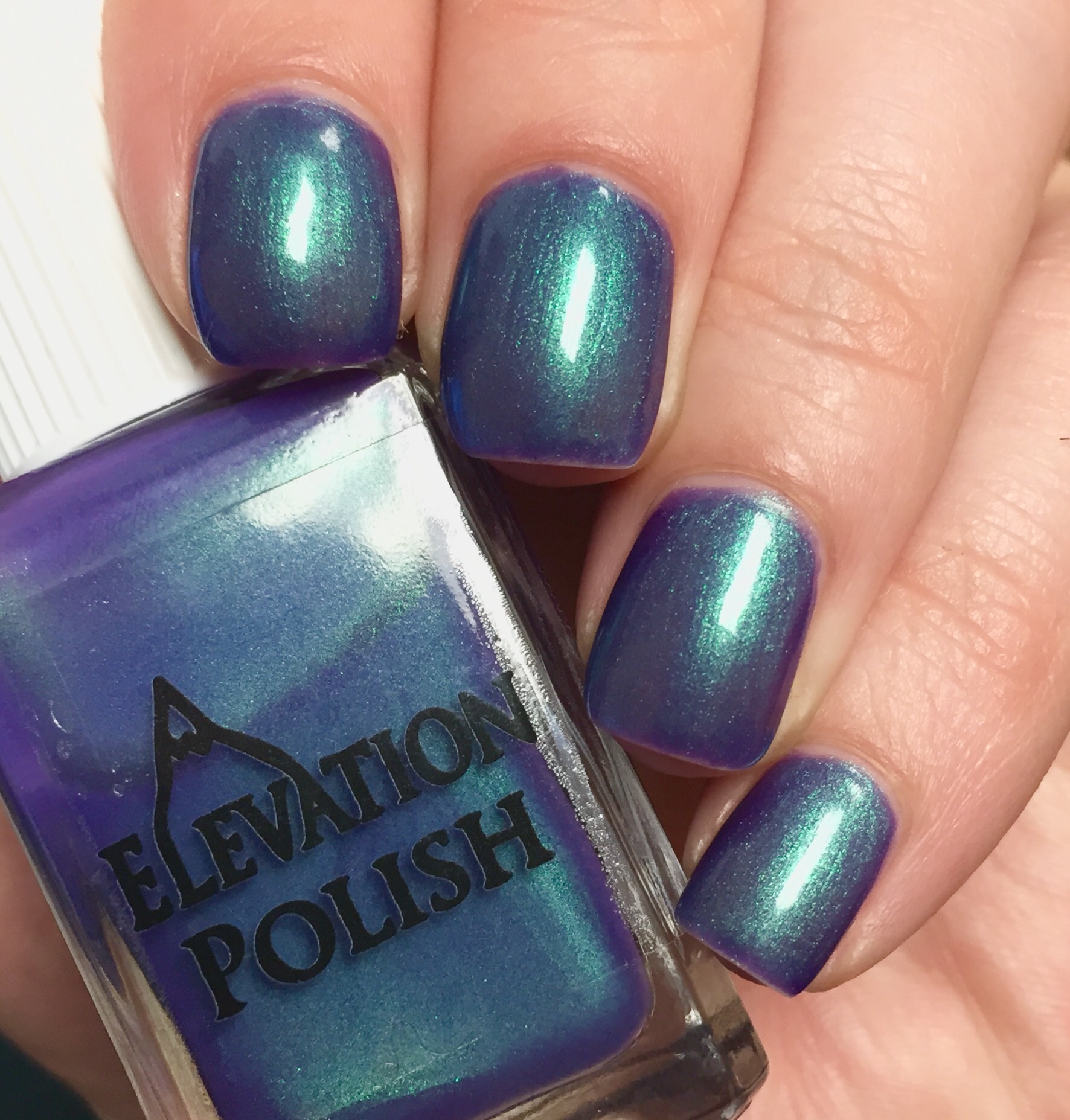 Luckily, there’s nail polish to lift my spirits. Today I’ve got a polish that I’ve been eyeing for more than a year, and I finally got it. This is “Pic de Subenuix” by Elevation, a lighter purple packed with green shimmer. This is a bit of a chameleon- leaning lavender in the sun and more blurple indoors. I included pictures in different light to give you a sense.