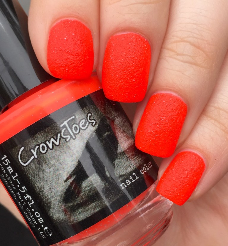I was obsessed with CrowsToes “Bulls#!t Detector” from the moment I saw the first swatches- and I feel even more in love from the first coat. It is an eye-searingly bright coral neon. Depending on the light, it either leaned more PINK or more ORANGE (it’s an all caps type of color). My boyfriend suggested I should pose with a traffic cone for the swatch pics. My camera could barely control itself. In addition to the NEON color, this also has small holographic glitter and is textured. I really like how it all comes together and wearing it is a bold, fun experience.