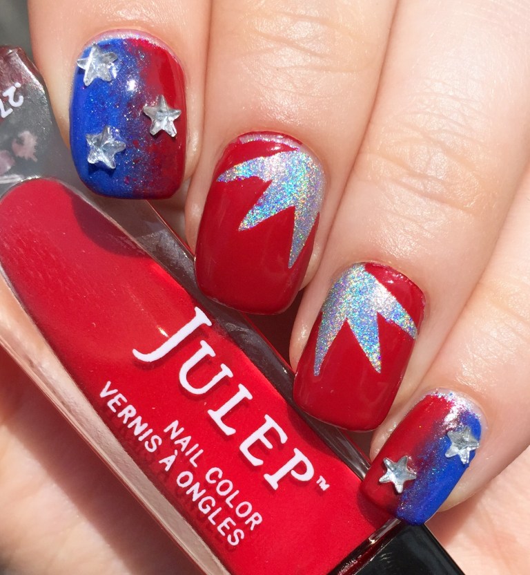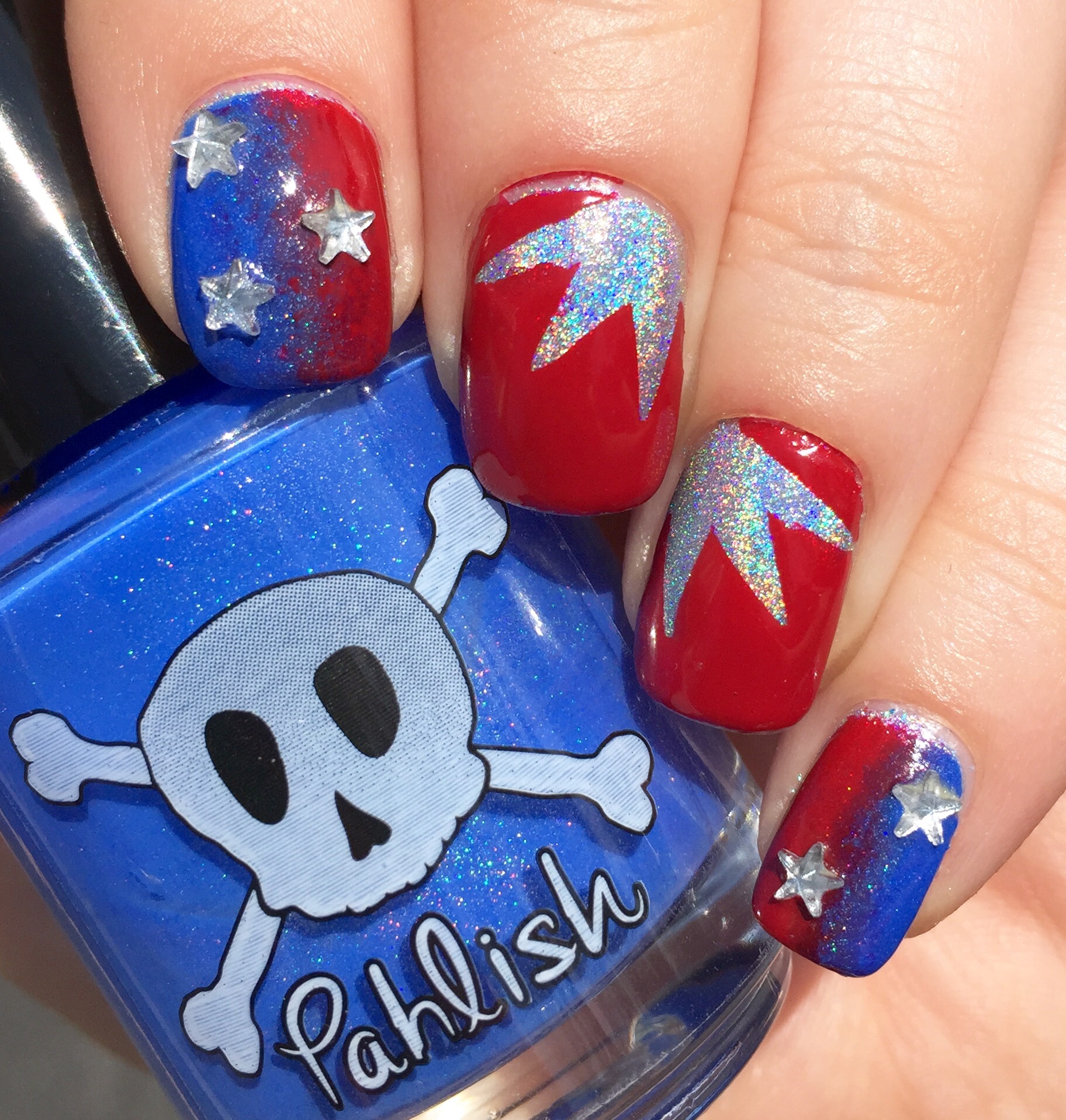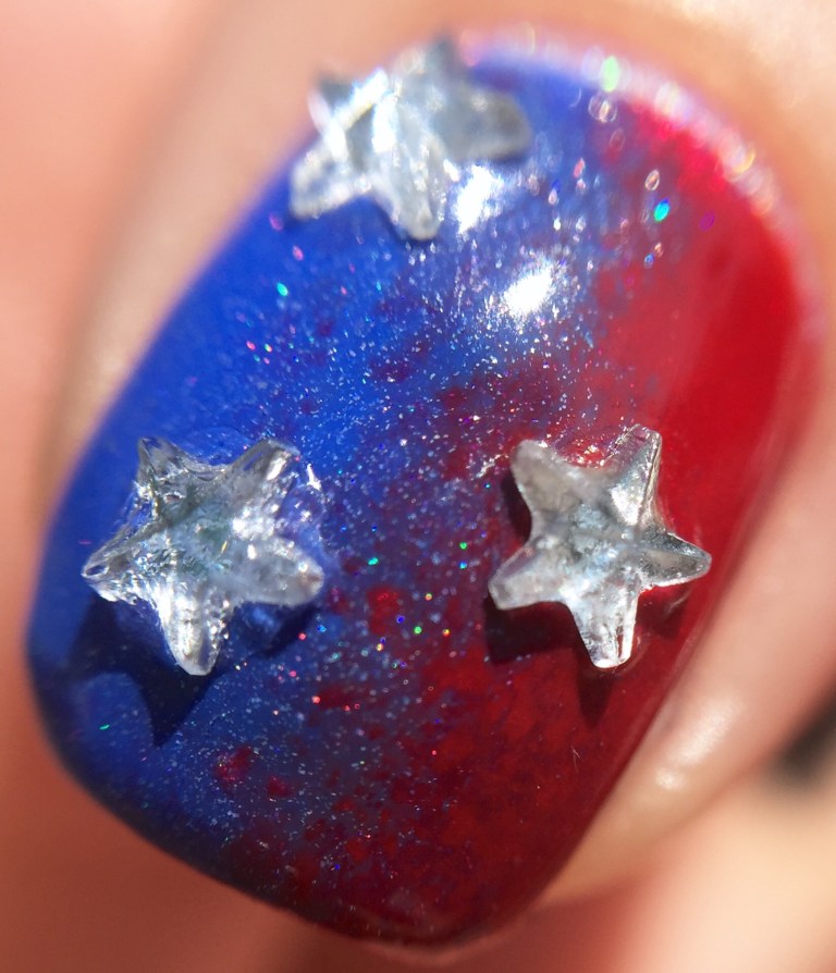 For my index and pinky fingers, I sponged on a gradient of Pahlish “Sailing the Hispaniola” (reviewed here) and Julep “Karissa.” Because I am a terrible person, it amuses me that I used a pirate themed polish for my patriotic mani. On topic the gradient, I added 3D white stars to keep the design from being too abstract. I really like how this looked, but dang those stars are a pain in the butt. They started catching on things and falling off immediately. By the time I took the pictures, they are all gone on my dominant hand, and I had to glue one back on for the left hand.