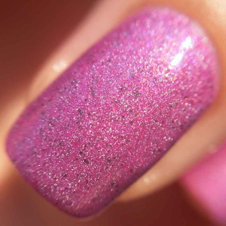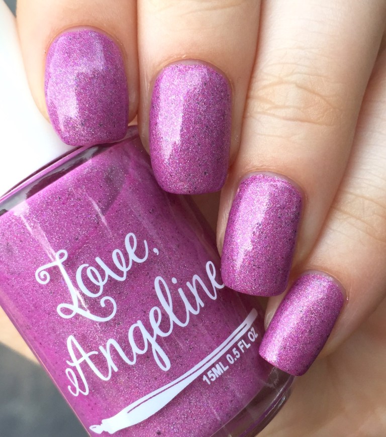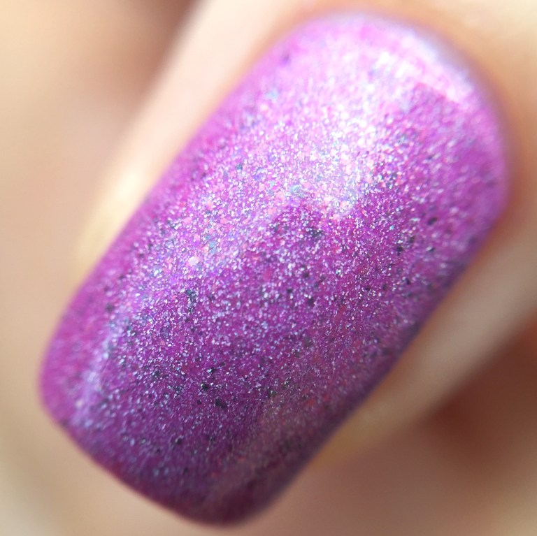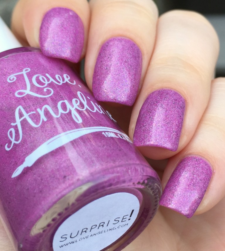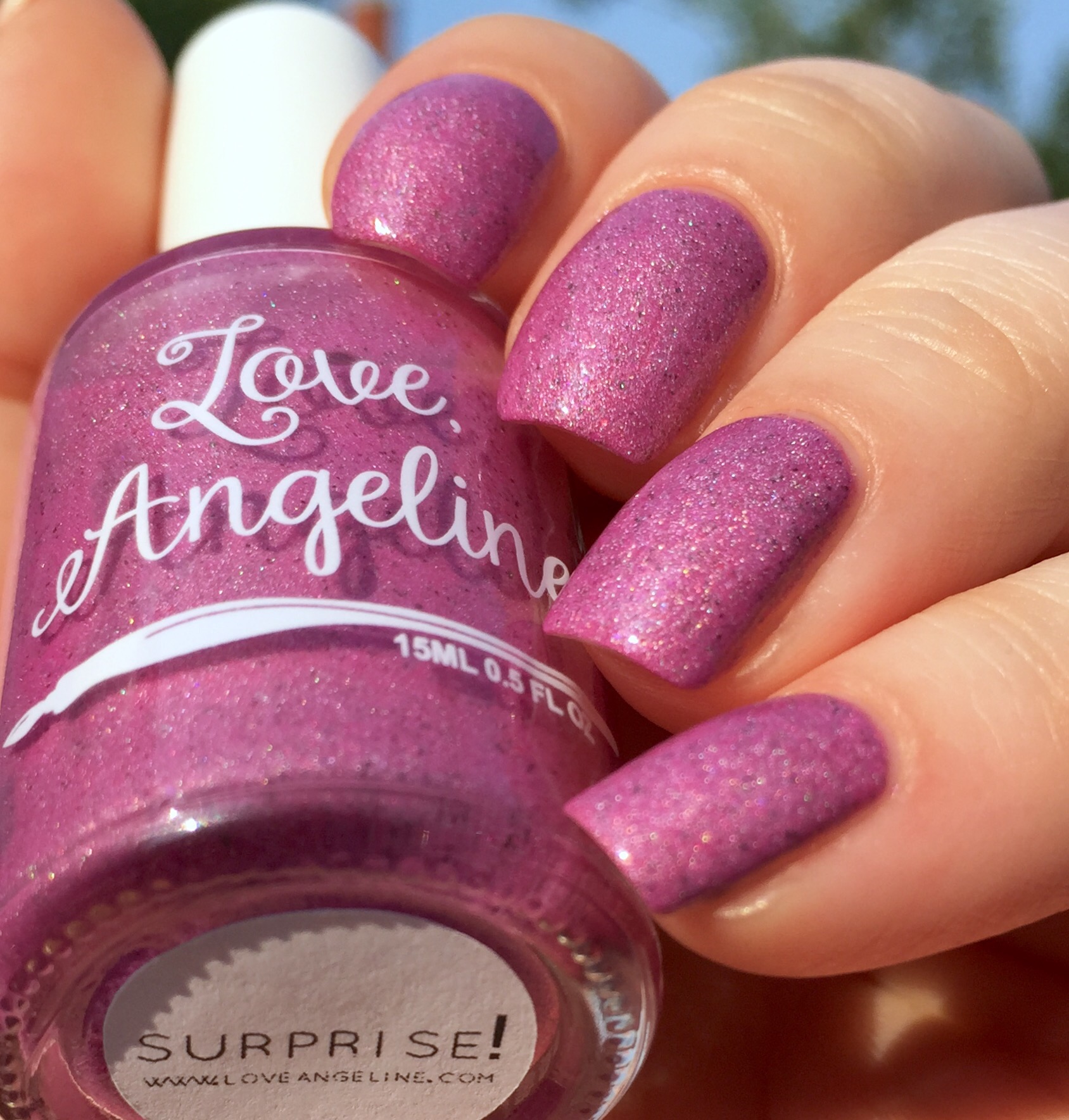 Never fear, though! I do have an awesome polish to show you today! This is Love, Angeline “Surprise!” A warm purple with a ton of depth. It has teeny light flakies and slightly bigger dark flakies, along with a dusting of holo that makes it come alive and glow in the sunlight.
