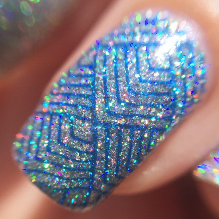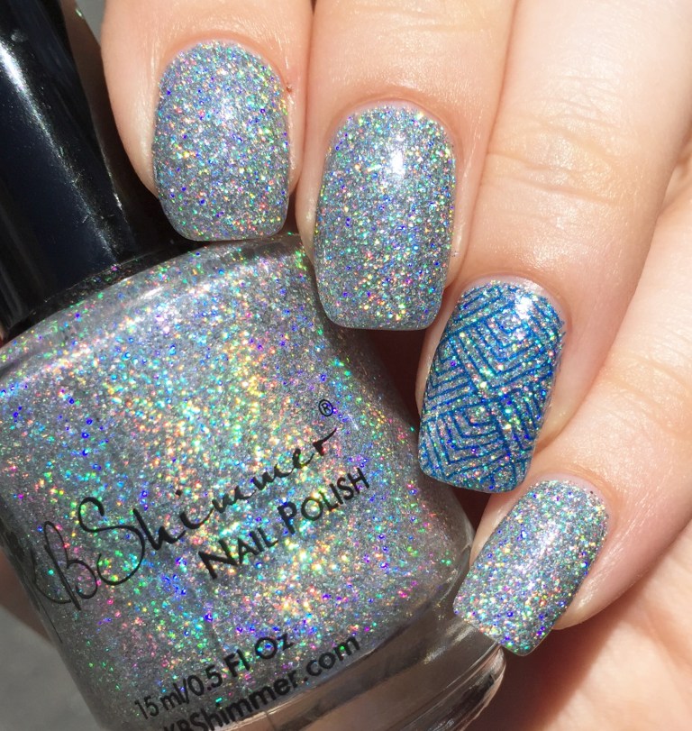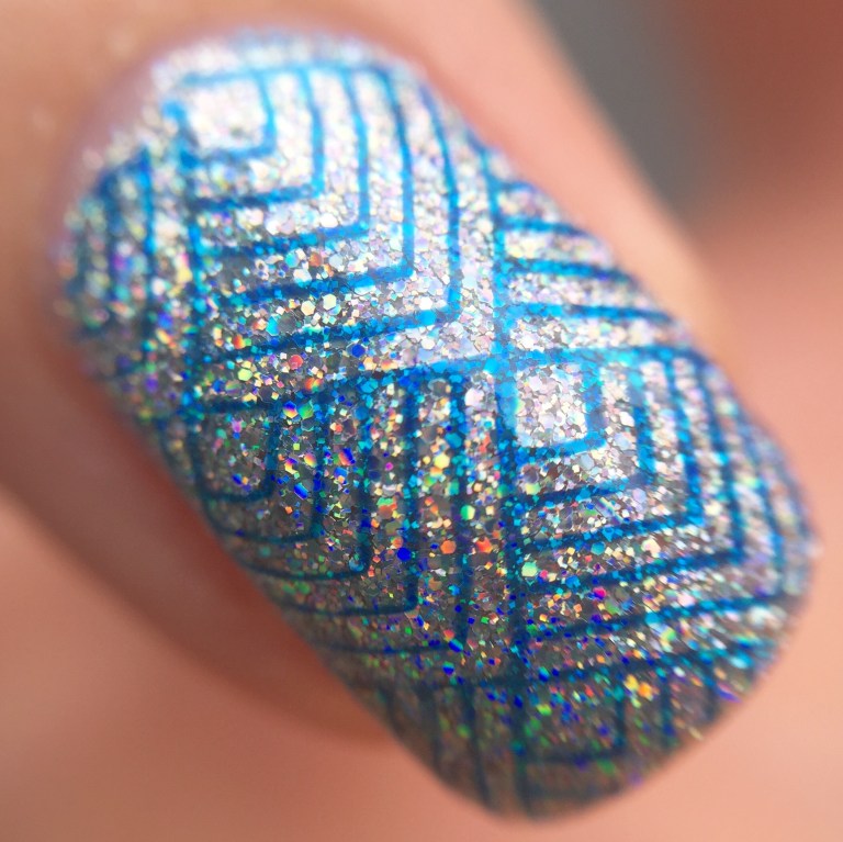The next four shots are in the shade. You can see that it comes off more silver, but the scattered, glittery, holo goodness is still there in force. I love it. Even indoors I felt like a full-on Vegas showgirl. This has different (generally very small) glitter than catches the light to create a big impression. This felt so special that I changed my mind about covering it up with nail art and just did an Art Deco accent using Bundle Monster BM-XL03 and the blue Bundle Monster stamping polish.