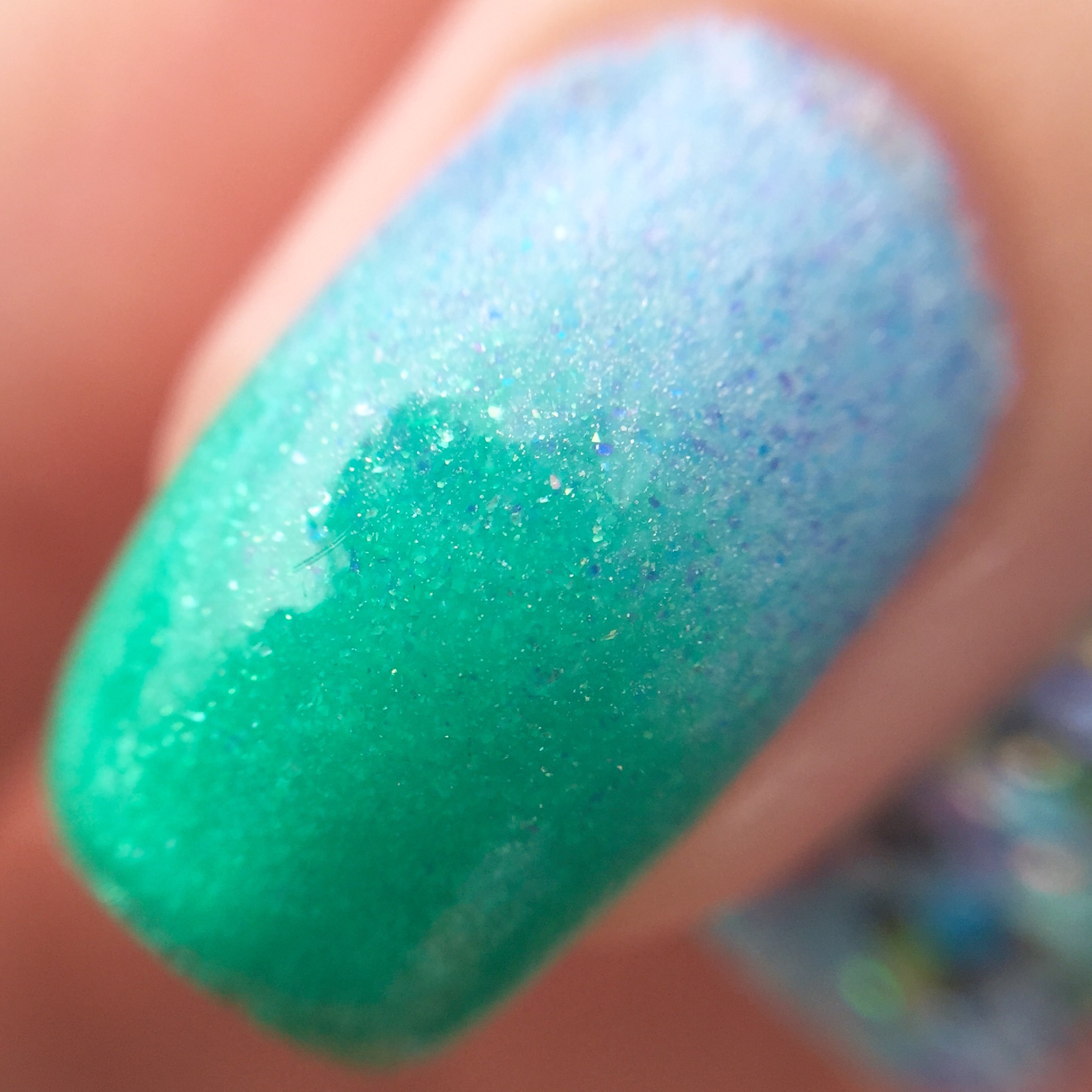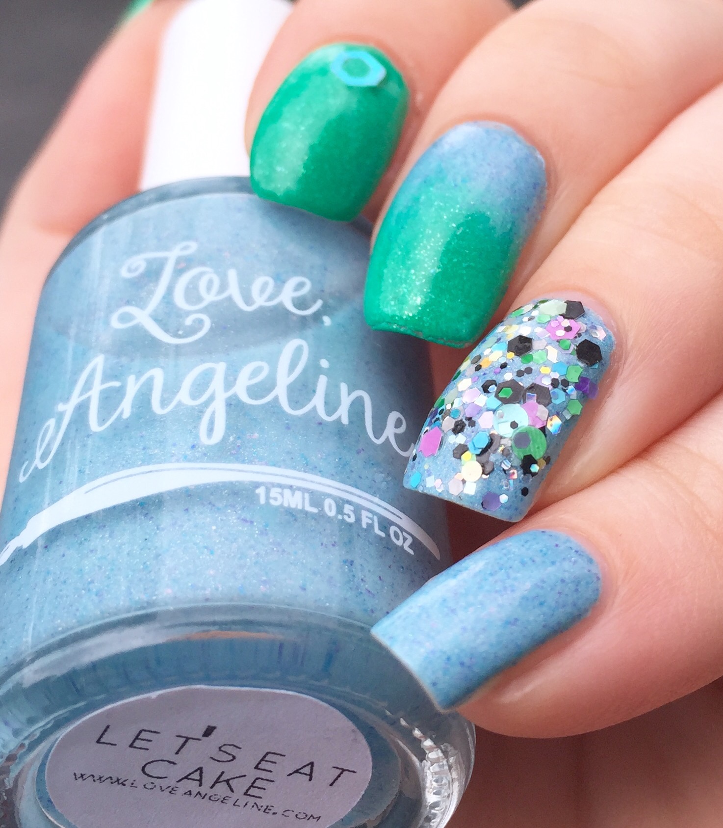 To zazz things up, I sponged on some glitter (a Lone, Angeline prototype from a mystery bag) on my ring finger over “Let’s Eat Cake.” To be honest, this glitter was the impetus for the whole mani- I’ve been dying to wear it, but couldn’t figure out what color would be best under it. Hence the mix of blue and green to echo the glitter colors. To tie in the glitter accent with the rest of the mani, I added a big, blue hex glitter (from a pack of glitter babies from Vibrant Vinyls) to my pointer finger.