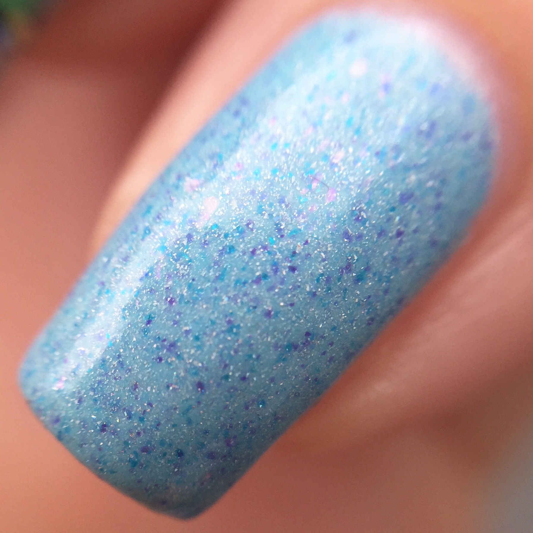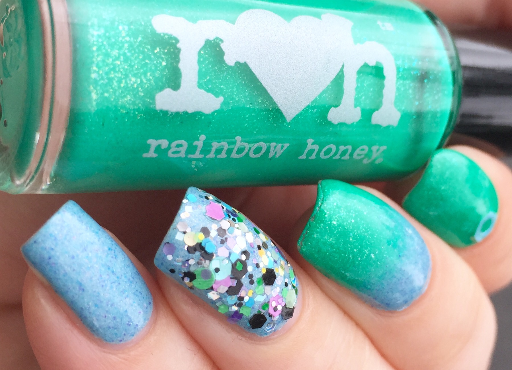 On my pointer finger, I’ve got Rainbow Honey “Calama,” a bright green with gold flakies. This came in the monthly mystery bag from Rainbow Honey (which I get because I really like their lip balms and bath/body products). I think it was also be available on their website later. On my middle finger, I have a gradient of “Calama” and Love, Angeline “Let’s Eat Cake.” This has a formula similar to “Surprise!” (reviewed here)- two easy, smooth coats packed with blue and purple flakies, with a kick of scattered holo thrown in. (Unfortunately you can’t see the holo due to the cruddy weather here.) on the plus side, this is still in stock on the Love, Angeline website, in case blues are your kryptonite. I am always wearing “Let’s Eat Cake” on my ring and pinkie fingers.