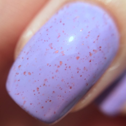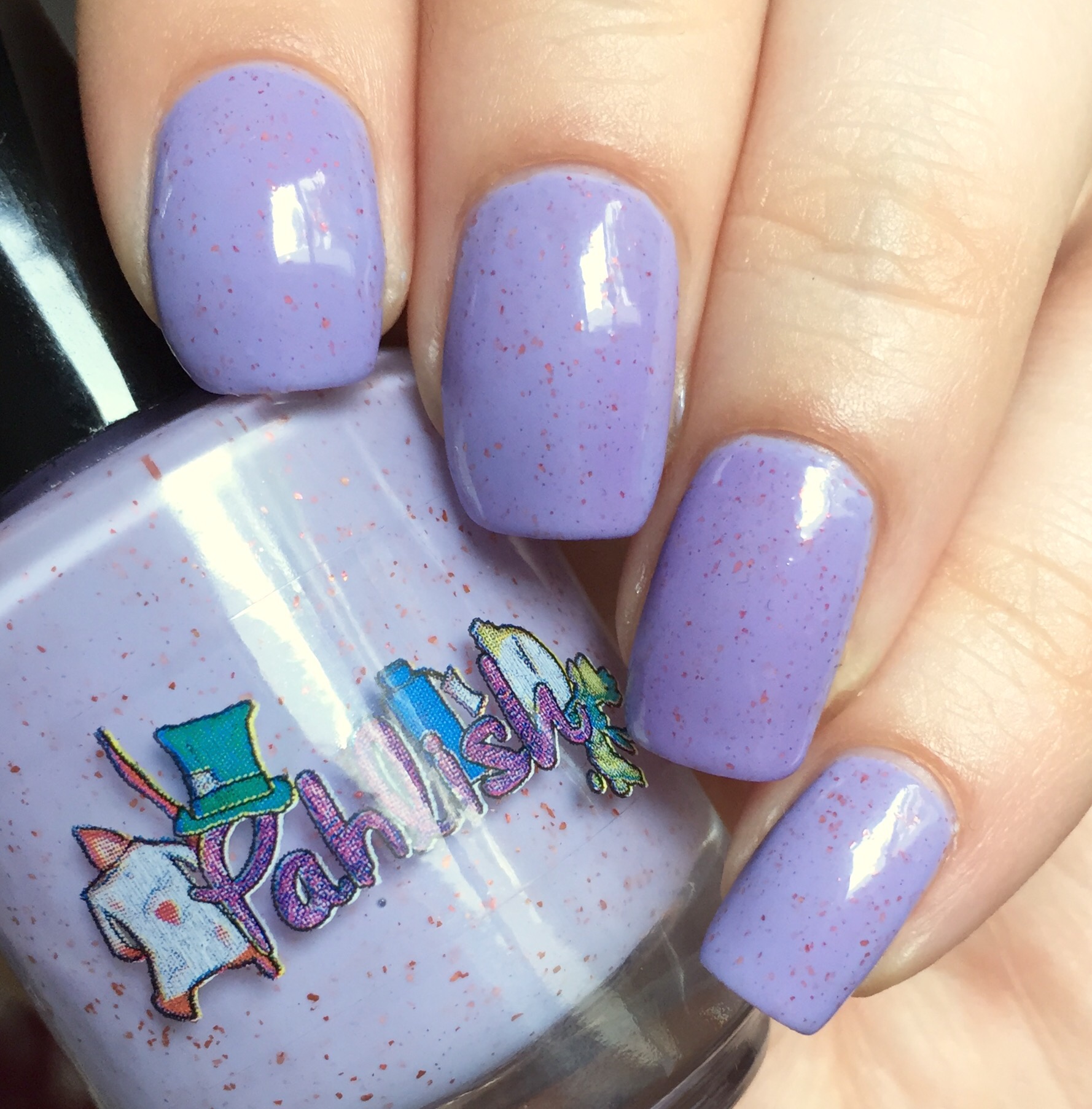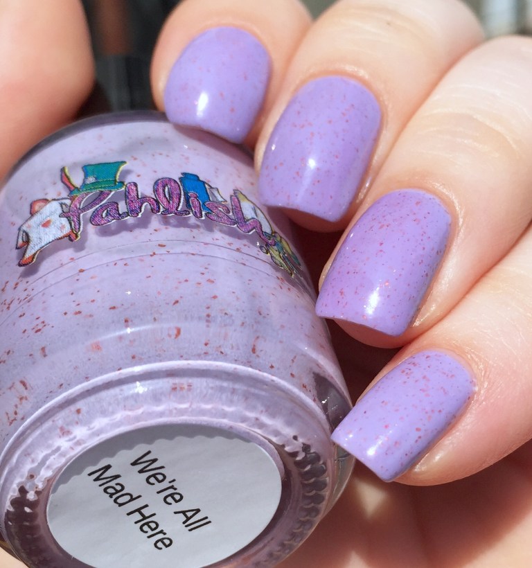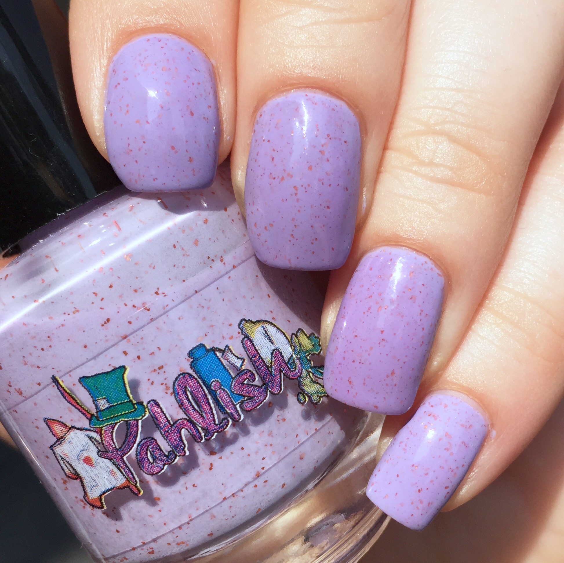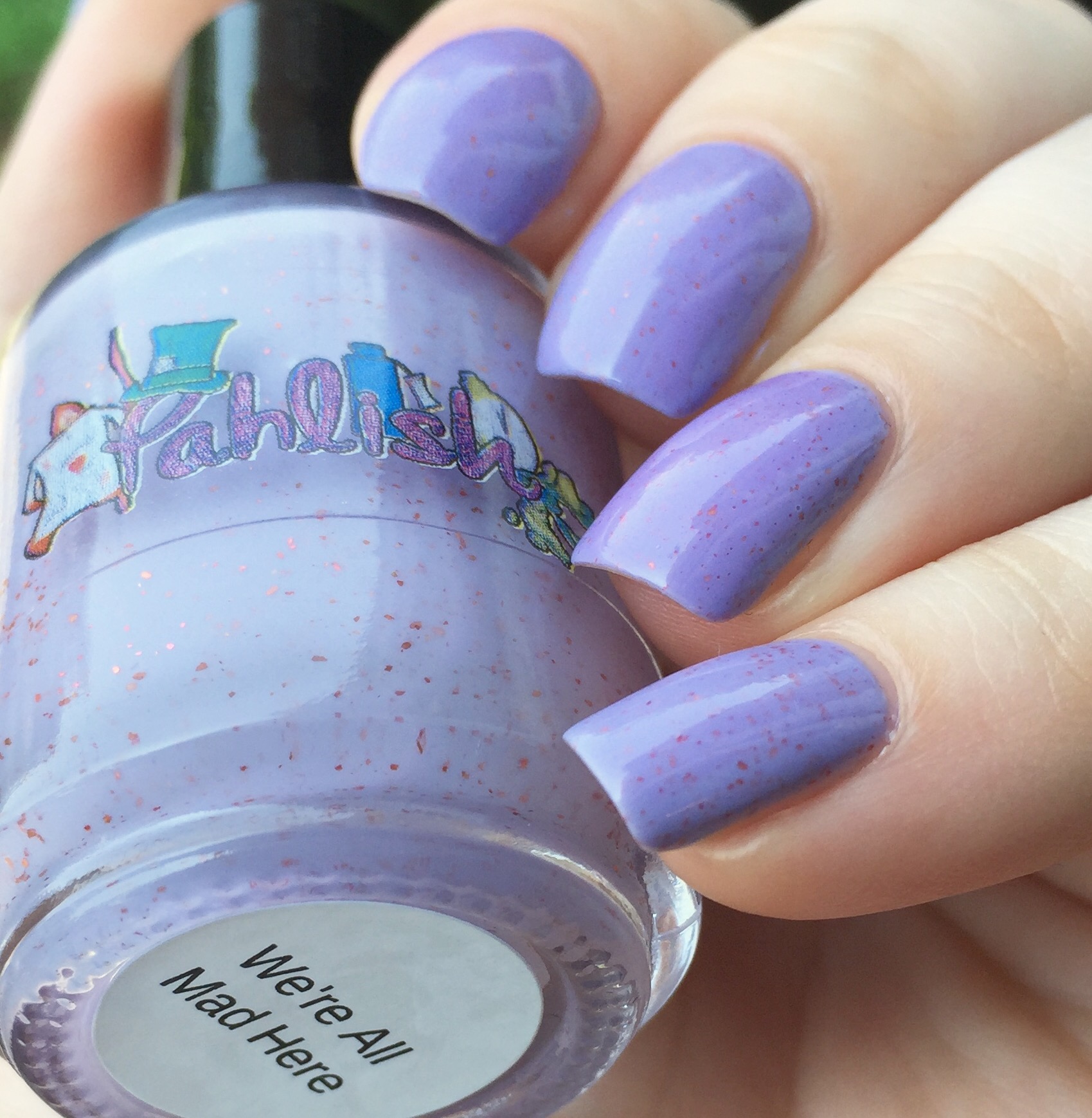 It’s the middle of the work week and I’m starting to think I might be going crazy (truth: I’ve been nuts this whole time). Since I’m going work stir-crazy, I decided to show off “We’re All Mad Here,” from Pahlish’s recent Alice in Wonderland collection. This bad boy is a gorgeous creamy violet-purple with reddish copper flakies.