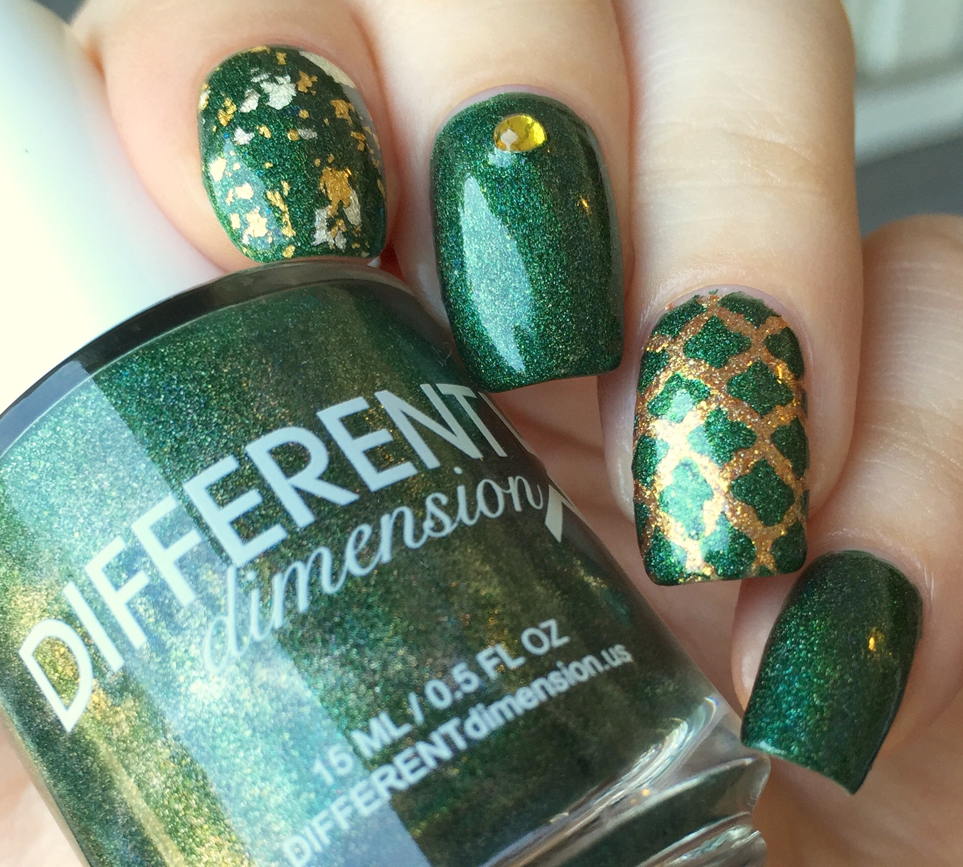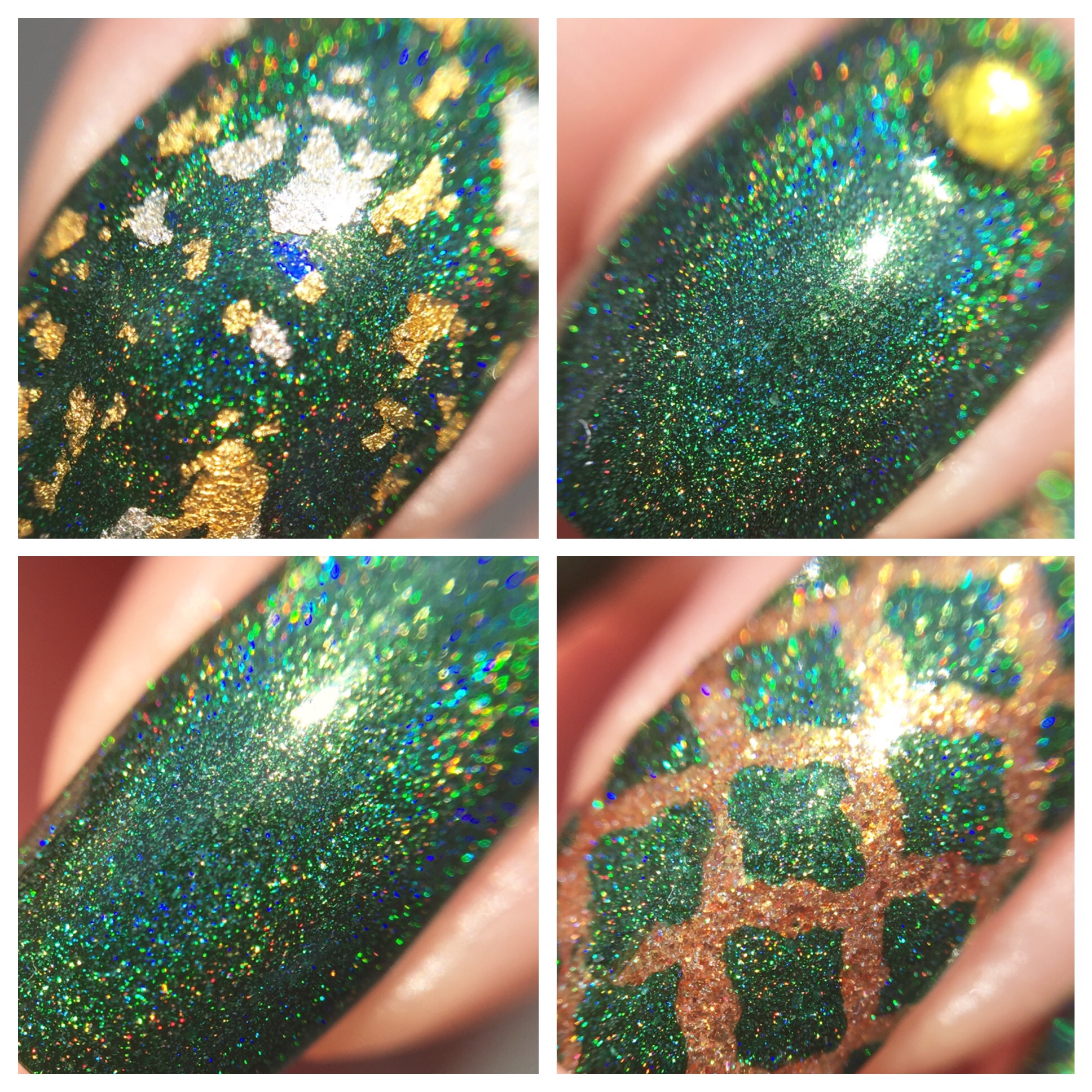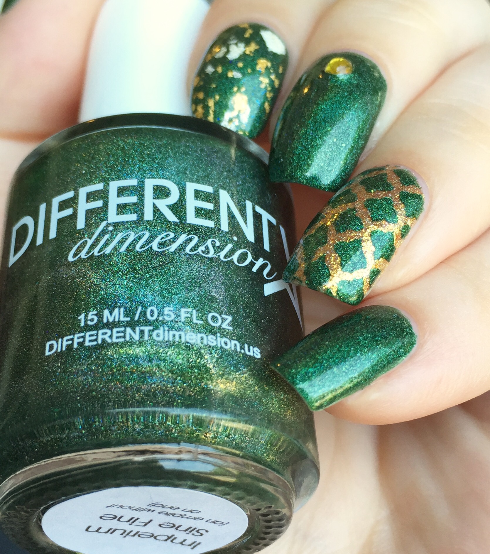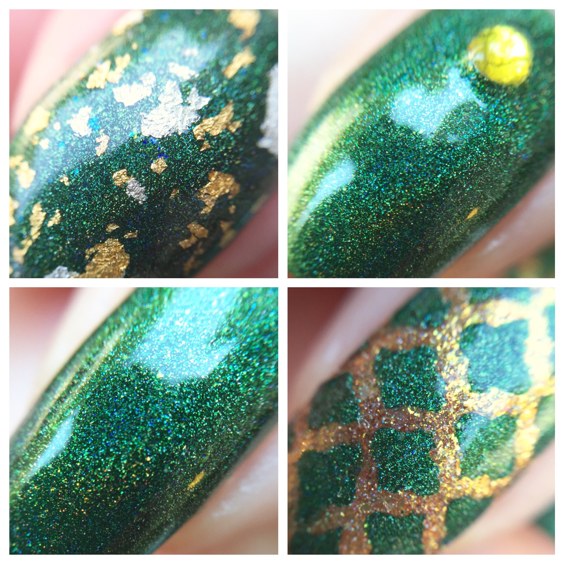 The gold undertone in the green made me go a little nuts with the nail art. I used WingDust “Gilty Pleasure” as a topper on my pointer finger. This might be my favorite topper ever (probably something to do with the real gold bits and blue iridescent flakes)- I use this whenever possible and then carefully guard it like I’m Smaug the rest of the time. On my ring finger, I used Pahlish “Fields of Gold” (from another A Box, Indied; reviewed here) as a base. Then I sponged “Imperium Sine Fine” over Vibrant Vinyls’ quatrefoil stencils.