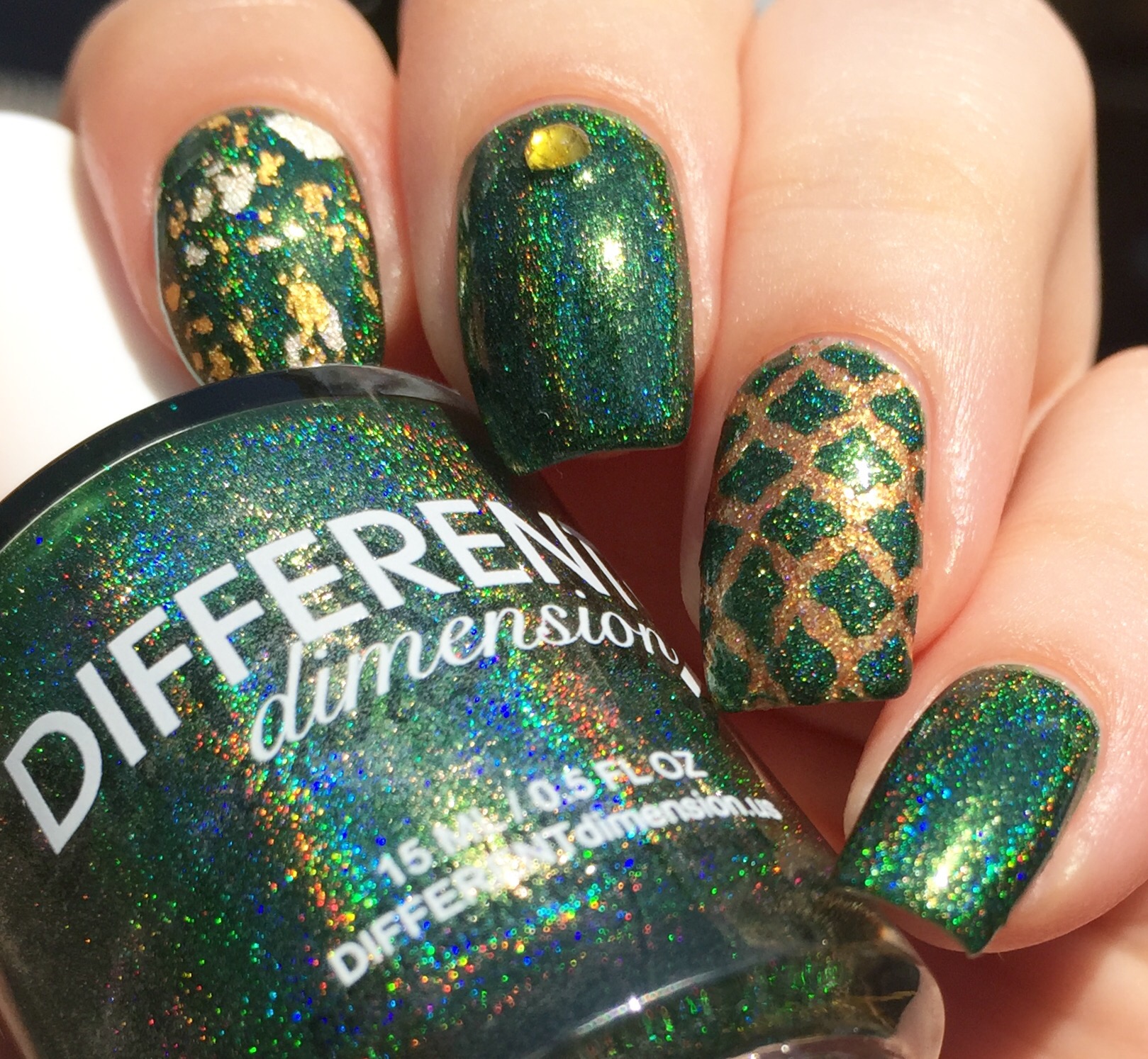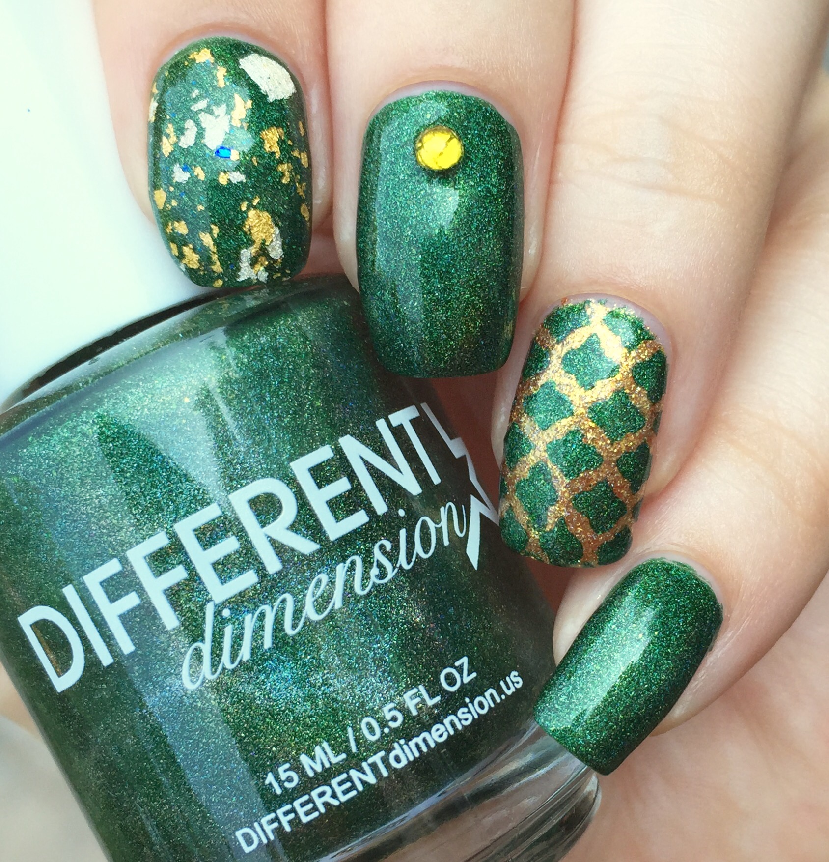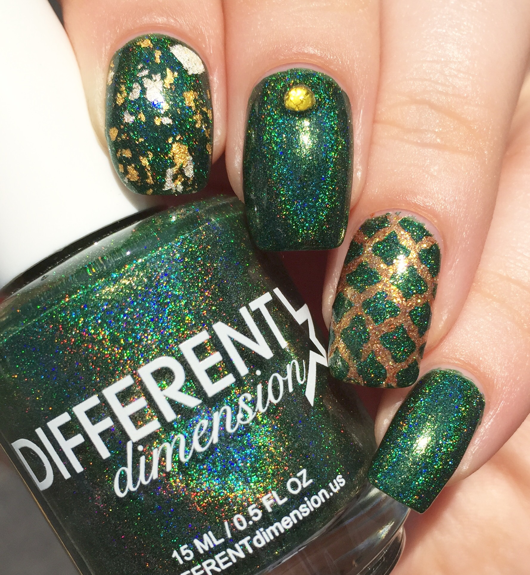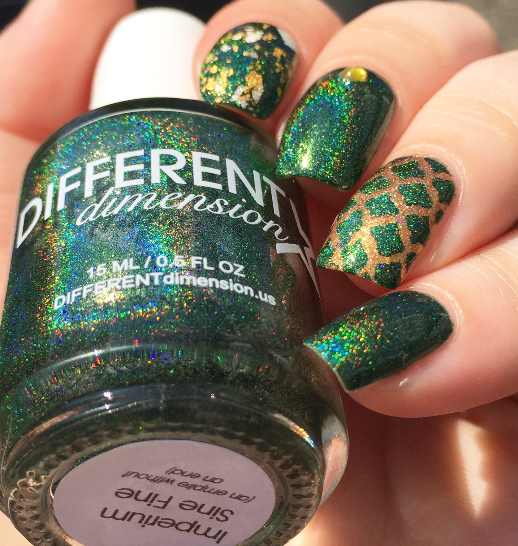 The gold undertone in the green made me go a little nuts with the nail art. I used WingDust “Gilty Pleasure” as a topper on my pointer finger. This might be my favorite topper ever (probably something to do with the real gold bits and blue iridescent flakes)- I use this whenever possible and then carefully guard it like I’m Smaug the rest of the time. On my ring finger, I used Pahlish “Fields of Gold” (from another A Box, Indied; reviewed here) as a base. Then I sponged “Imperium Sine Fine” over Vibrant Vinyls’ quatrefoil stencils.