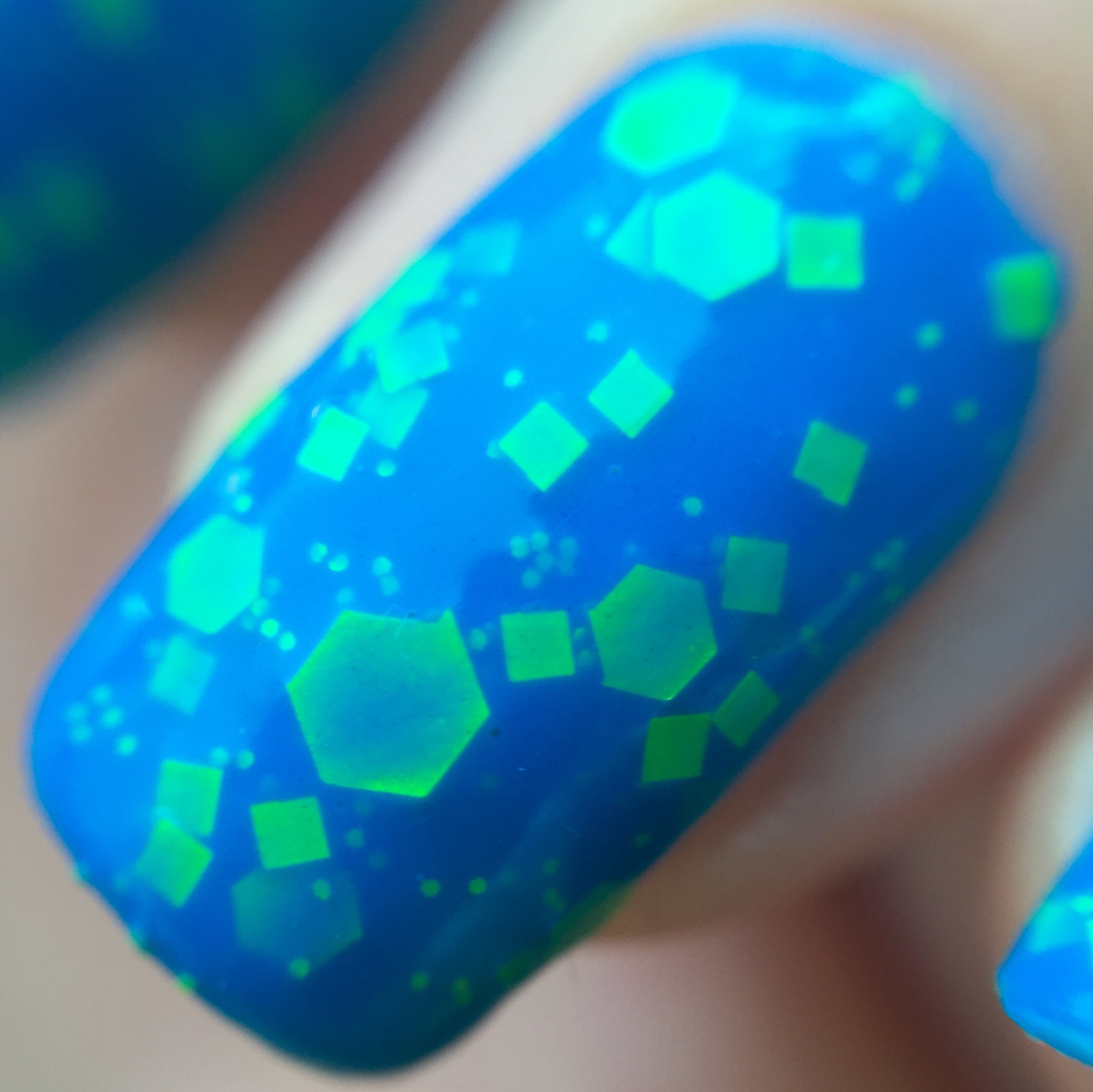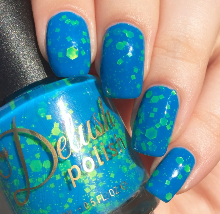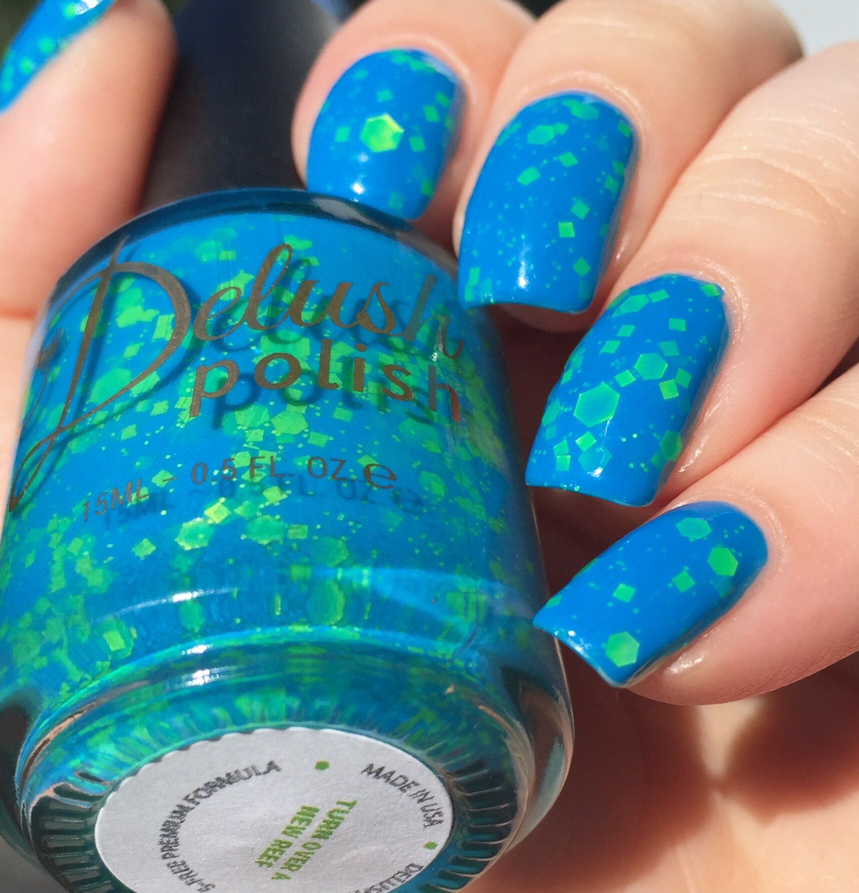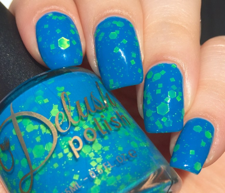 Where has Delush been all my life? Why was I so anti-glitter for all those years? I’m just going to admit it: I want wrong an now I’ve seen the light. The glittery, disco-ball infused light. Delush’s amazing blue crelly with neon green glitter, “Turn over a New Reef,” is so fantastic that after painting on two coats, I immediately hopped online to go buy more from this brand. I was hooked that fast.