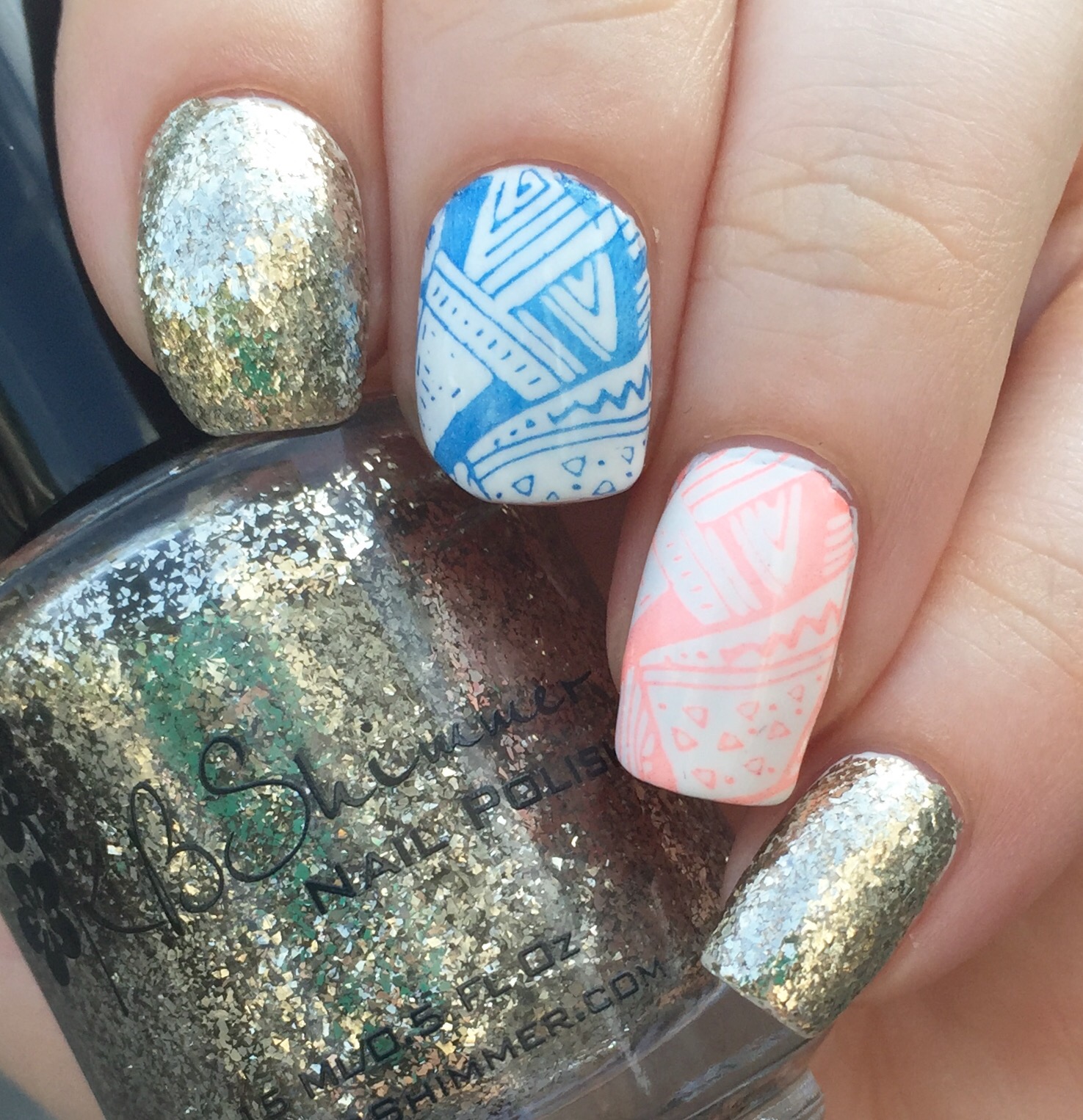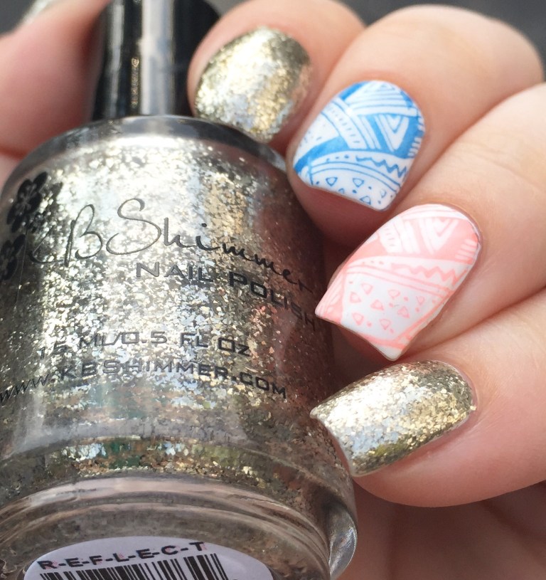 This look is a base of the white creme “That Base” from the now-defunct B Squared Lacquer. I bought this a while back as a base for gradients and other nail art, and have yet to use it much. I used two coats for opacity here (on all my nails, not just the middle two). Over that, I used two coats of KBShimmer “R-E-F-L-E-C-T” for silver flakie goodness on my pointer and pinkie. On my short middle nail, I stamped using Cupcake Polish “Et Tu, Brute” (a blue holo from the August A Box, Indied) and Bundle Monster BM-XL22 stamping plate. On my ring finger nail, I used the same plate and Pahlish “Man’s Red Flower” (a peachy neon holo) to stamp.