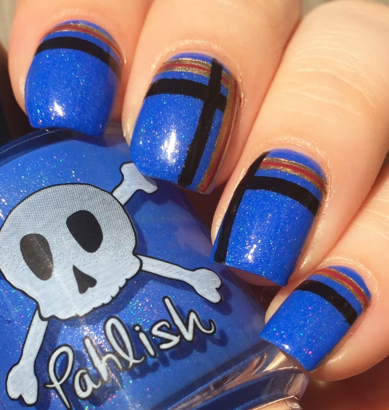 I used Pahlish “Sailing the Hispaniola” (reviewed here) as the base. Then, I constructed the plaid using 57 vinyl corners from KBShimmer (I find the corners easier to peel than the plain straight lines), Maybelline “Bold Gold,” Bellaoggi “Ladylike,” and Bundle Monster black stamping polish. I’m embarrassed to say that all those layers took me several hours. But dang, I am happy with how it turned out.