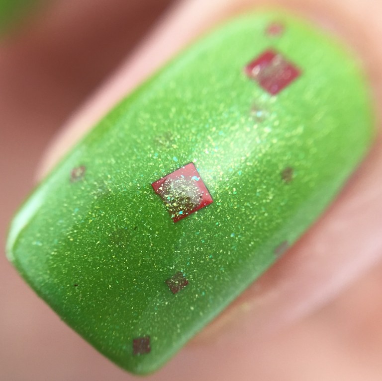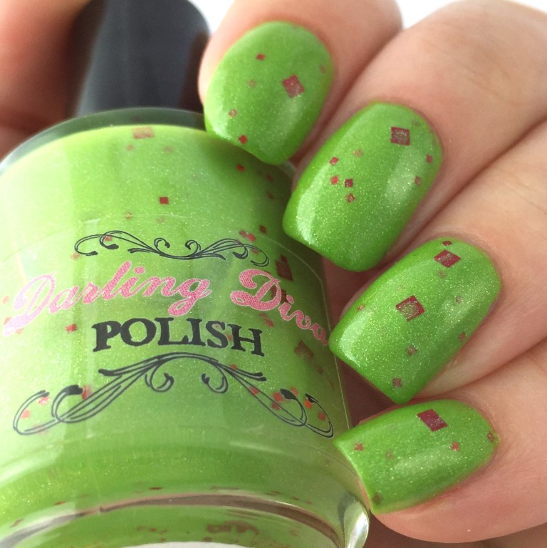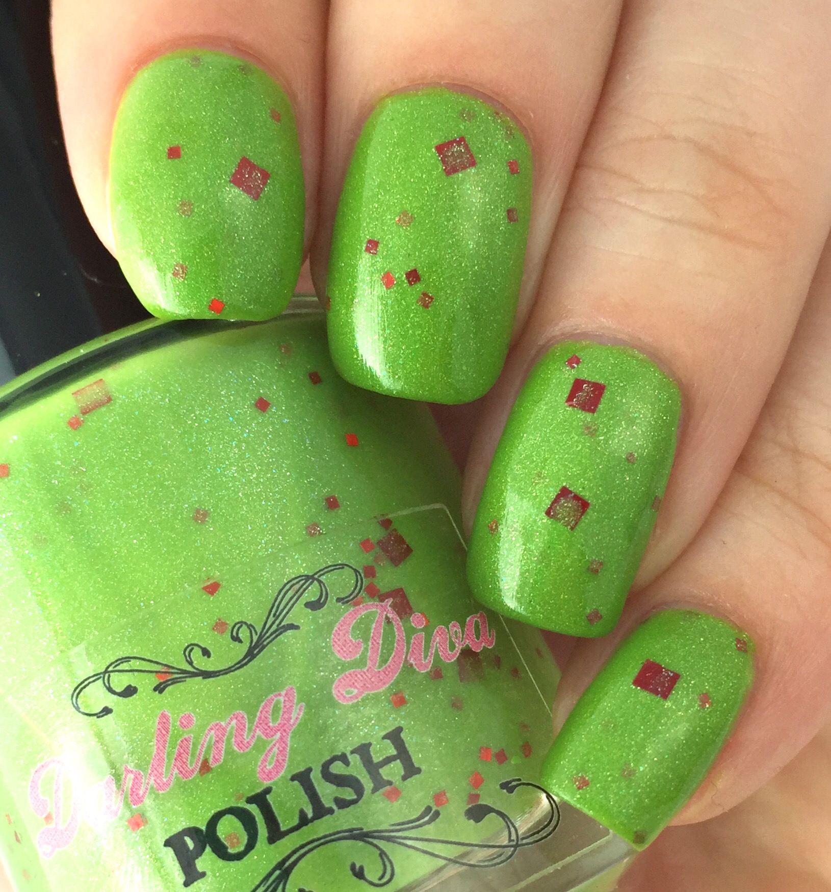 This is Darling Diva’s “Sheer Poetry,” a bright green holo with read square glitters in two sizes. For some reason, this polish strikes me as being Halloween-y. I think it’s the lime green base. I think it’s originally from a Christmas collection, though, which makes sense with the red and green color scheme. I went looking for this color online, and I’m pretty sure that my bottle (purchased a few months ago as part of a mystery bag) has a different formula than the original color of the same name. What I have is significantly more creamy and opaque, and much less holo, than older pictures I have seen online. Just a heads up!