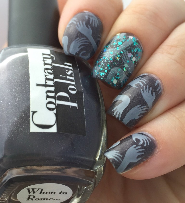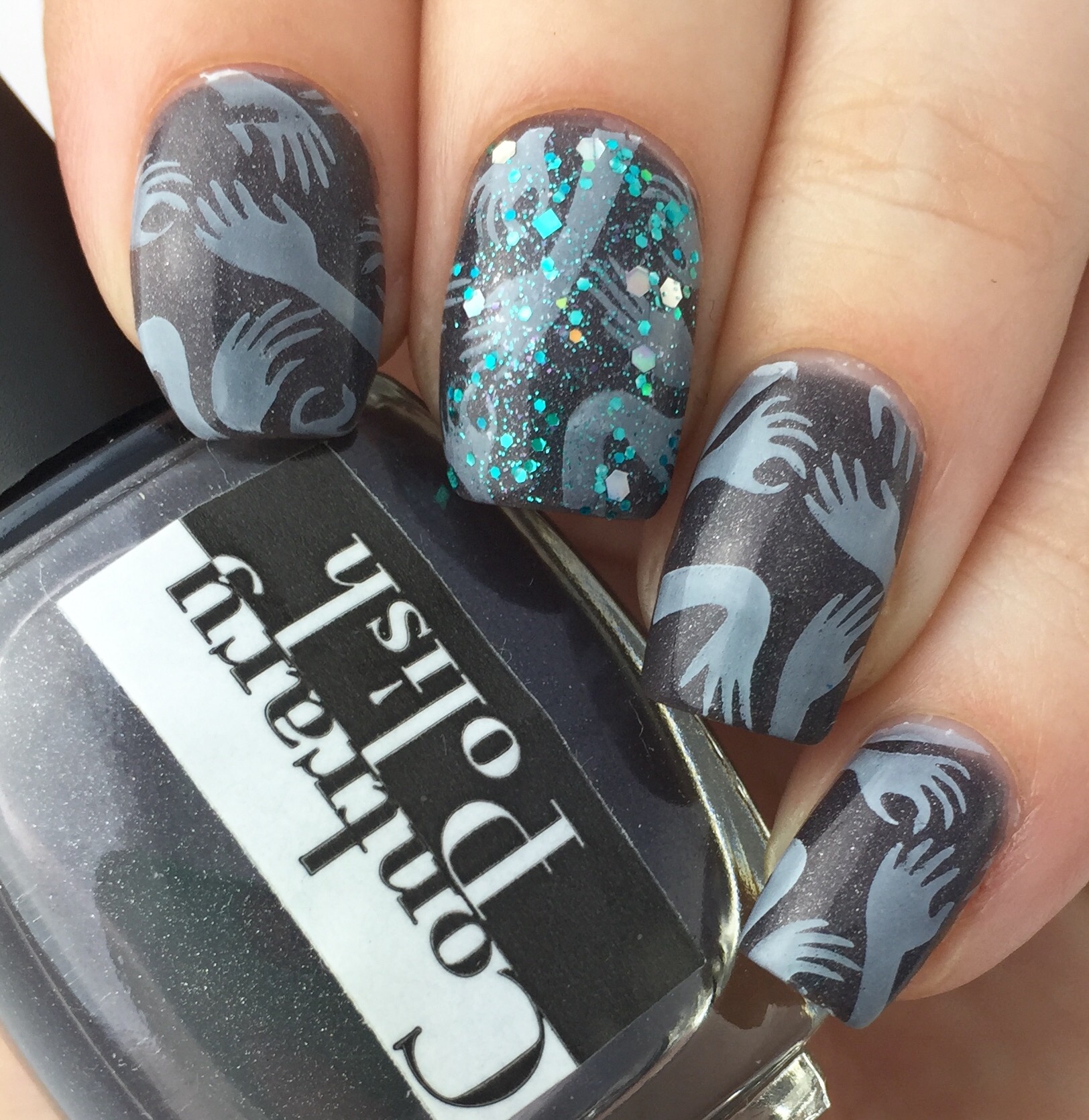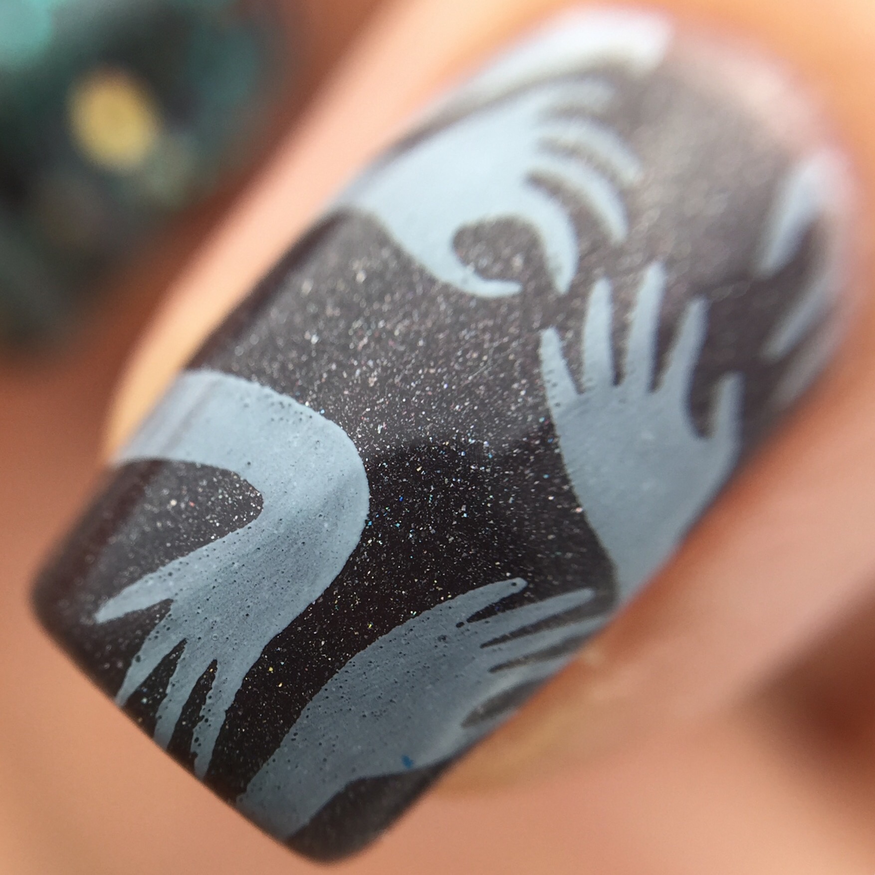 To pull off this look, I started with a charcoal gray base with a slight shimmer, Contrary Polish‘s “When in Rome” (from the August A Box, Indied). Over that, I used Bundle Monster’s BM-XL28 and Bundle Monster white stamping polish for the creepy hands. Bundle Monster’s white stamping polish isn’t the most opaque out there, which works perfectly for creating the illusion of a not-entirely-corporeal being (aka ghost). On top of it, I upped the spooky level by adding a silvery teal glitter topper from Rainbow Honey to obscure the ghost, Haunted Forest-style. (There’s always a haunted forest in ghost movies, right?)