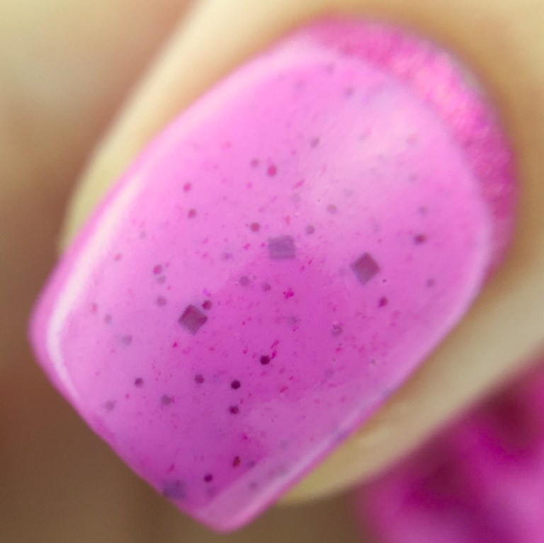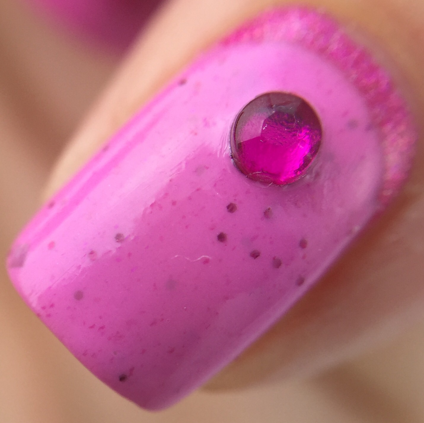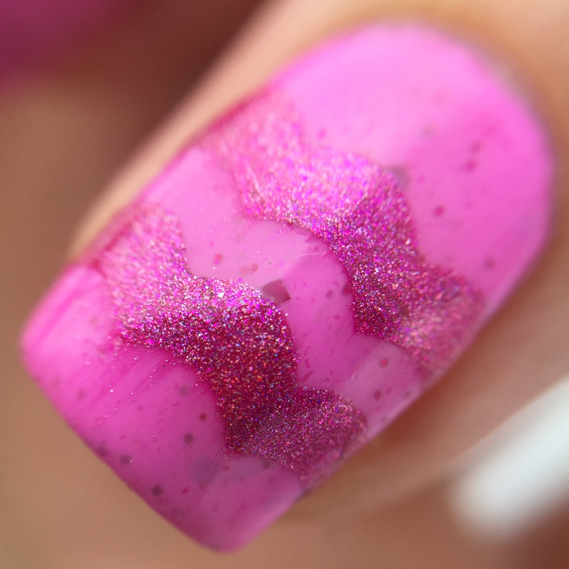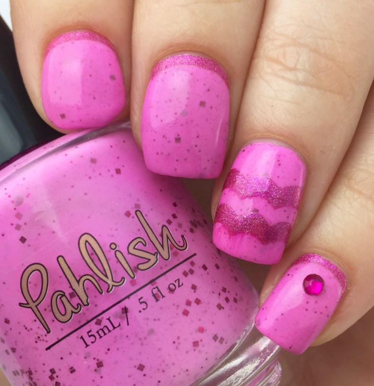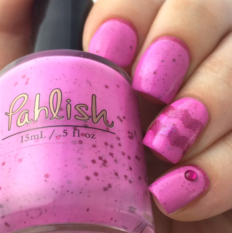 I’ve never tried the Ruffian trend before, so I thought it would be a good time to experiment. I think the Ruffian thing, where you later one color over the other, leaving a sliver showing at the base of your nail, has been around for at least a year now. I decided to start easy (and distracting) with the brightest pinks in my collection, Pahlish “Sugar Venom” (reviewed here) and Different Dimension “Saphir Rose” (reviewed here). I went with a subtle theme, yeah? For fun, I did an accent nail using Vibrant Vinyls’ scalloped vinyls.