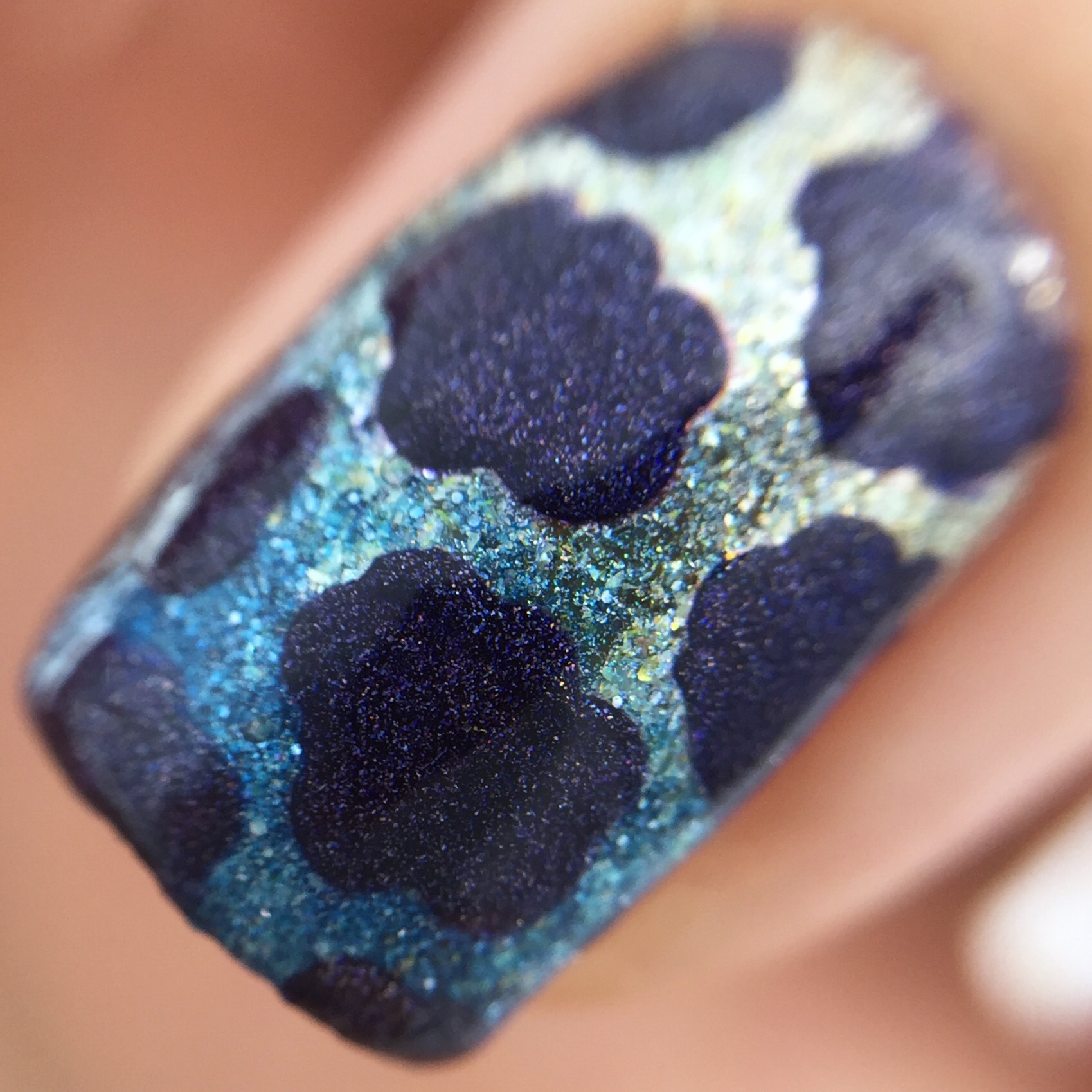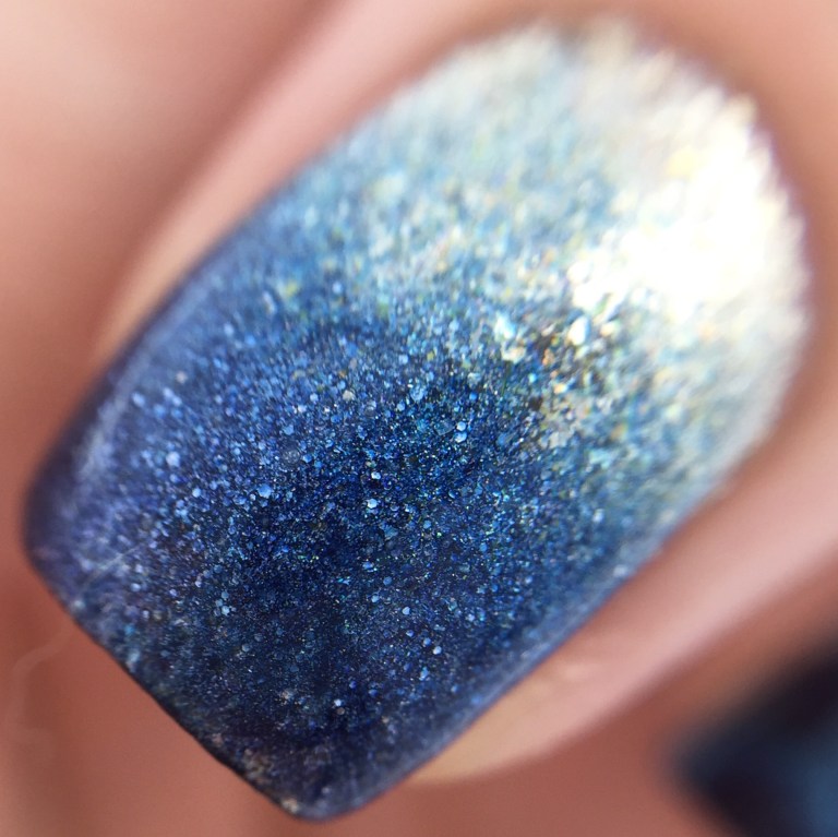 Behold the storm cloud holo gradient! I started with a base of ILNP “Fame” and sponged on a gradient of “Fame” and Colors by Llarowe “That Bloo is Mine!” and an inky purple “Oops” polish from a mystery bag.
