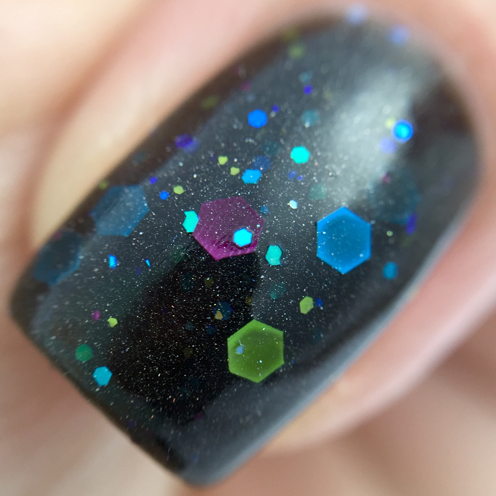 The duo is inspired by Disney’s Haunted Mansion. I love Disney, and I love the Haunted Mansion, so I was on board the moment I saw this duo. I hardly ever wear black polish because I think im too pale for it to work with my skintone- but this? This worked for me. Hurry Ba-ack is a black jelly with magenta, lime, and blue hexes, iridescent smal glitter, gold microglitter, and some serious gold shimmer. The depth to this is awesome- think “staring into a dark landscape” instead of the regular flat black of normal black polishes. (My inner nerd keeps wanting this polish to be called “Warp Speed” because it reminds me of the viewscreen in Star Trek when they engage warp. This polish is the final frontier!)