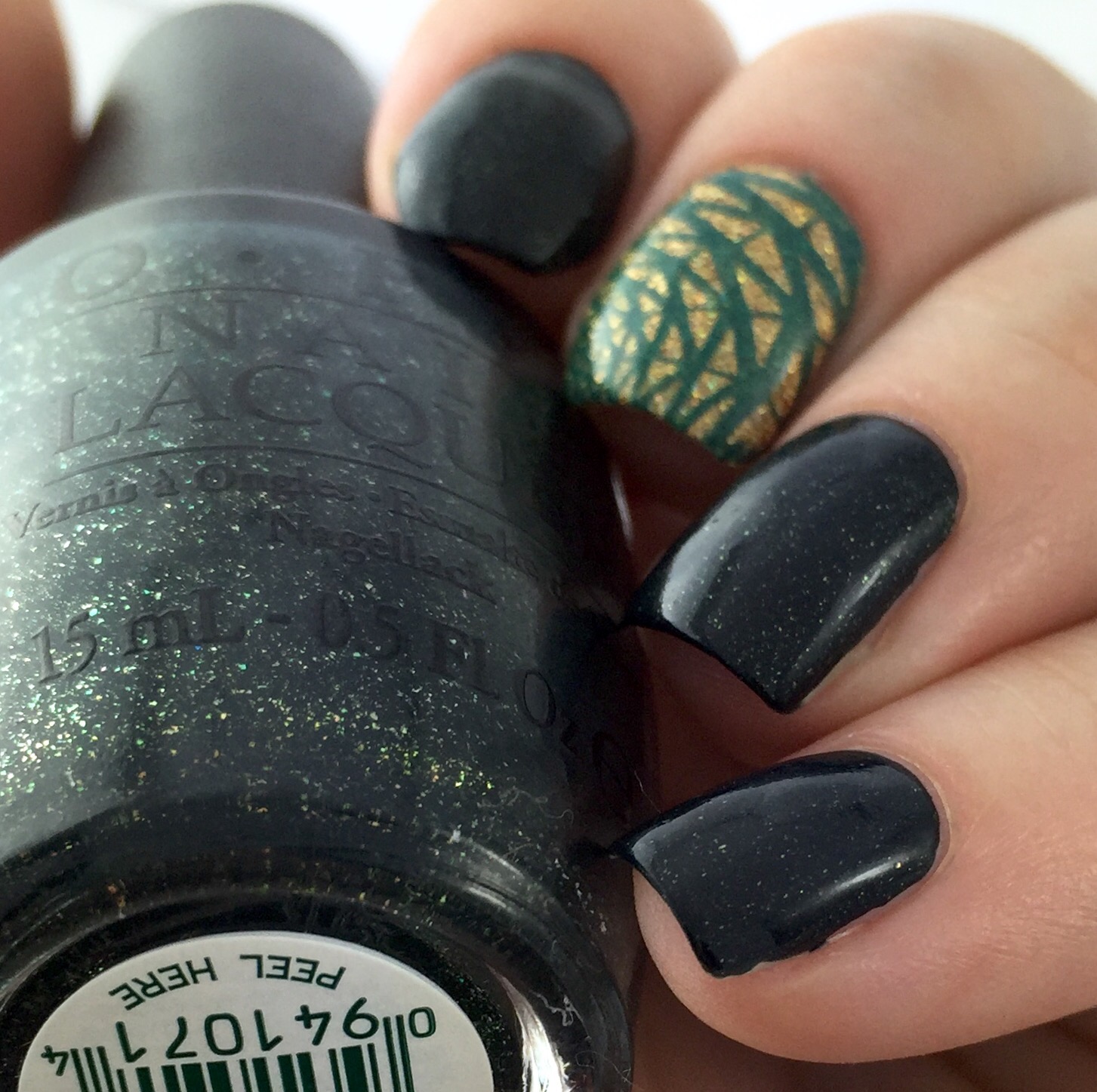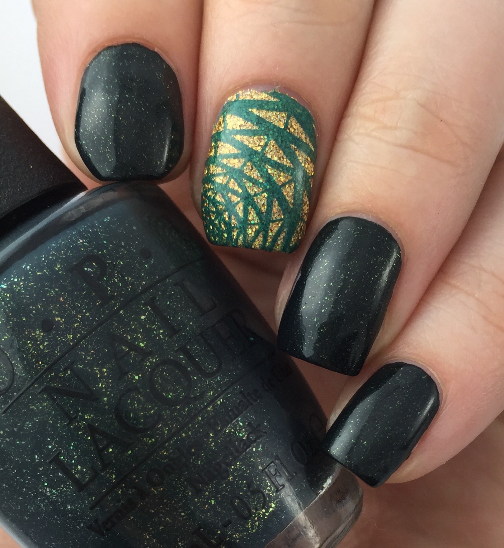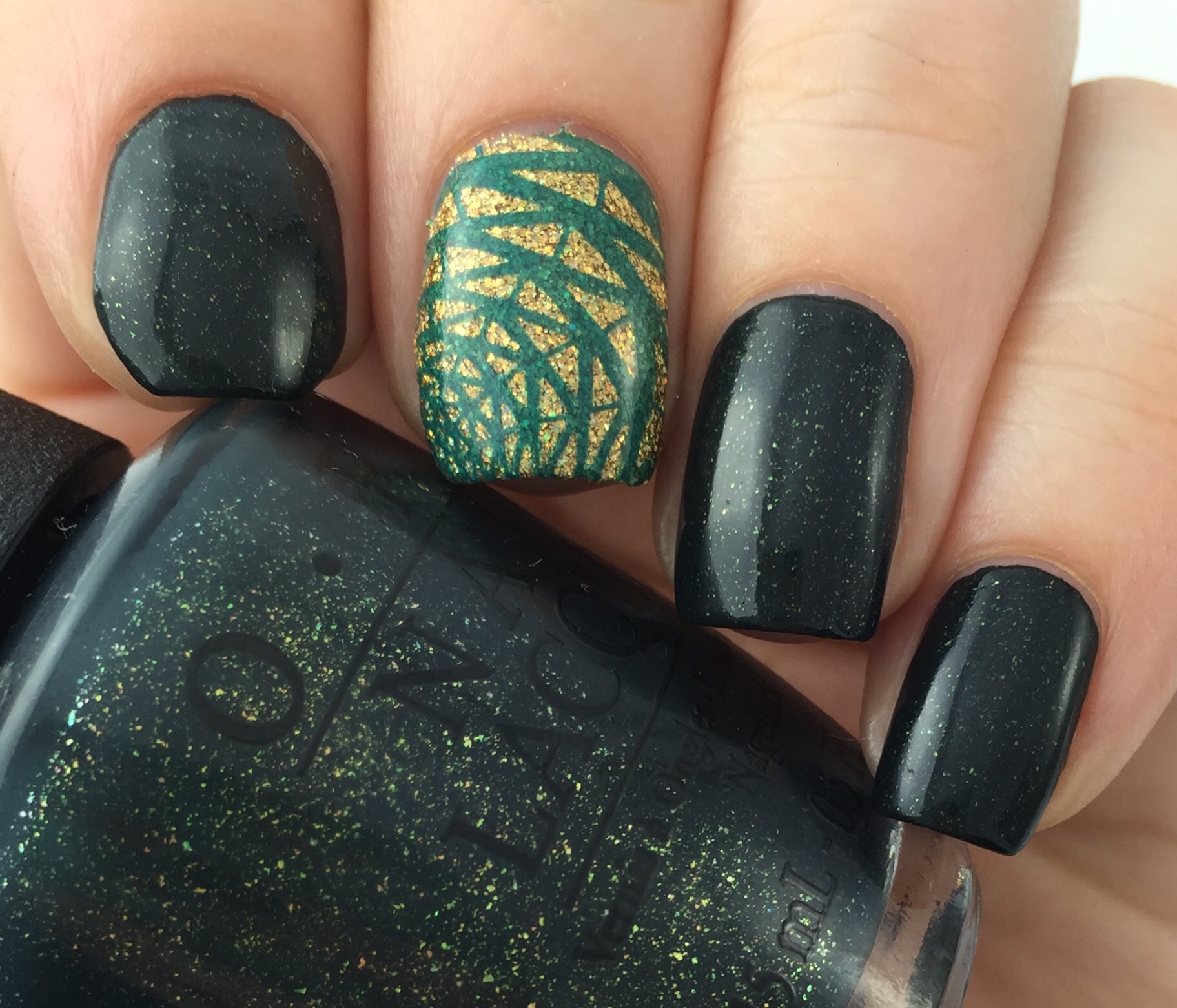 The dark blackened green with gold flakies is “Live and Let Die” (after the 1973 movie title- the eight film in the bond series and the first starring Roger Moore!)  With the new movie “Spectre” premiering this week, I had to do a Bond inspired mani using a Bond polish!