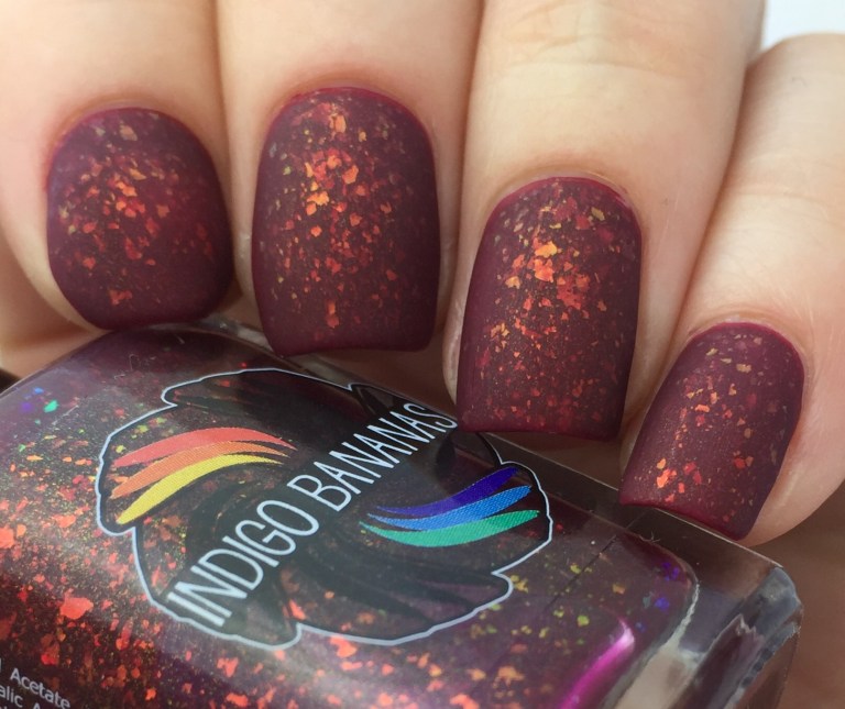First, it’s a real jelly jelly, meaning that the red base is pretty sheer. I’ve got it on here over a maroon creme. Luckily, the formula isn’t thick and dries down very well, so the extra layer of under-color wasn’t a problem at all. I like the different sized of duochrome flakes in this, and I think the flakes-to-base ratio works well for the formula (and for looks). I really like how the matte top coat (Essie “Matte About You“) highlights the flakies (maybe I just have a crush on matte top coat).
