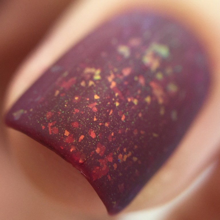 First, it’s a real jelly jelly, meaning that the red base is pretty sheer. I’ve got it on here over a maroon creme. Luckily, the formula isn’t thick and dries down very well, so the extra layer of under-color wasn’t a problem at all. I like the different sized of duochrome flakes in this, and I think the flakes-to-base ratio works well for the formula (and for looks). I really like how the matte top coat (Essie “Matte About You“) highlights the flakies (maybe I just have a crush on matte top coat).