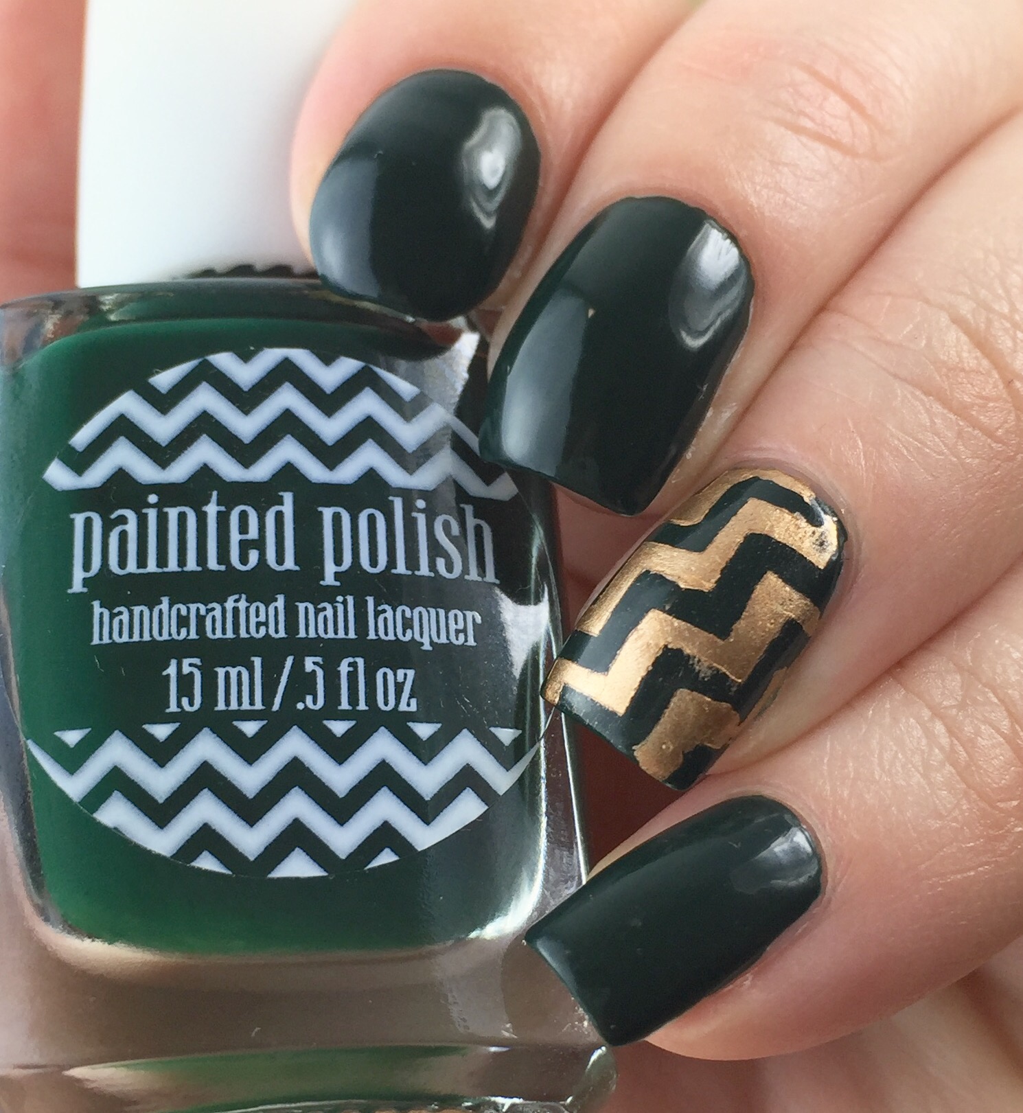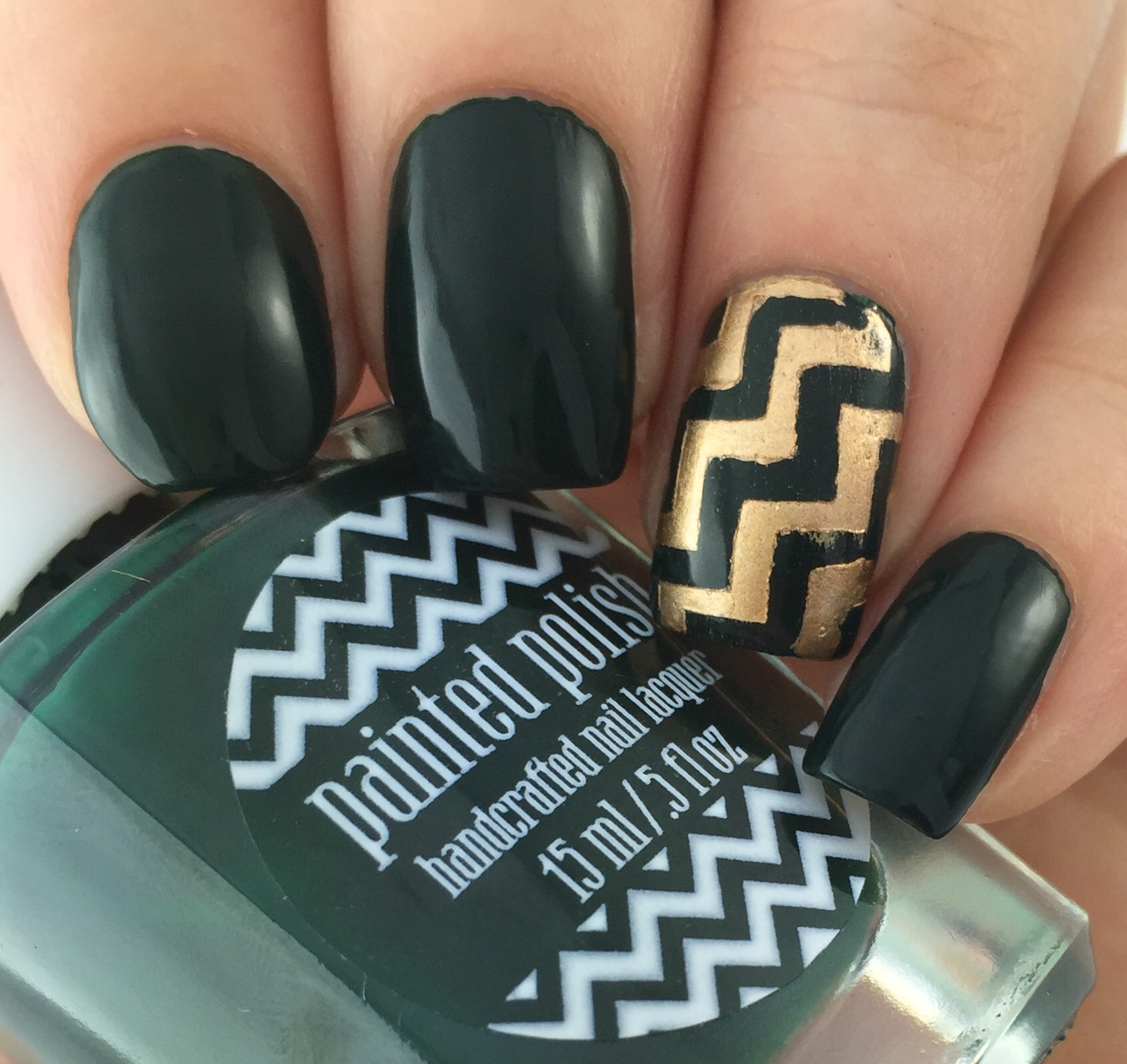 I was really loving the Painted Polish logo on the bottles, so I did a quick accent nail using KBShimmer zigzag vinyls and Maybelline Bold Gold.