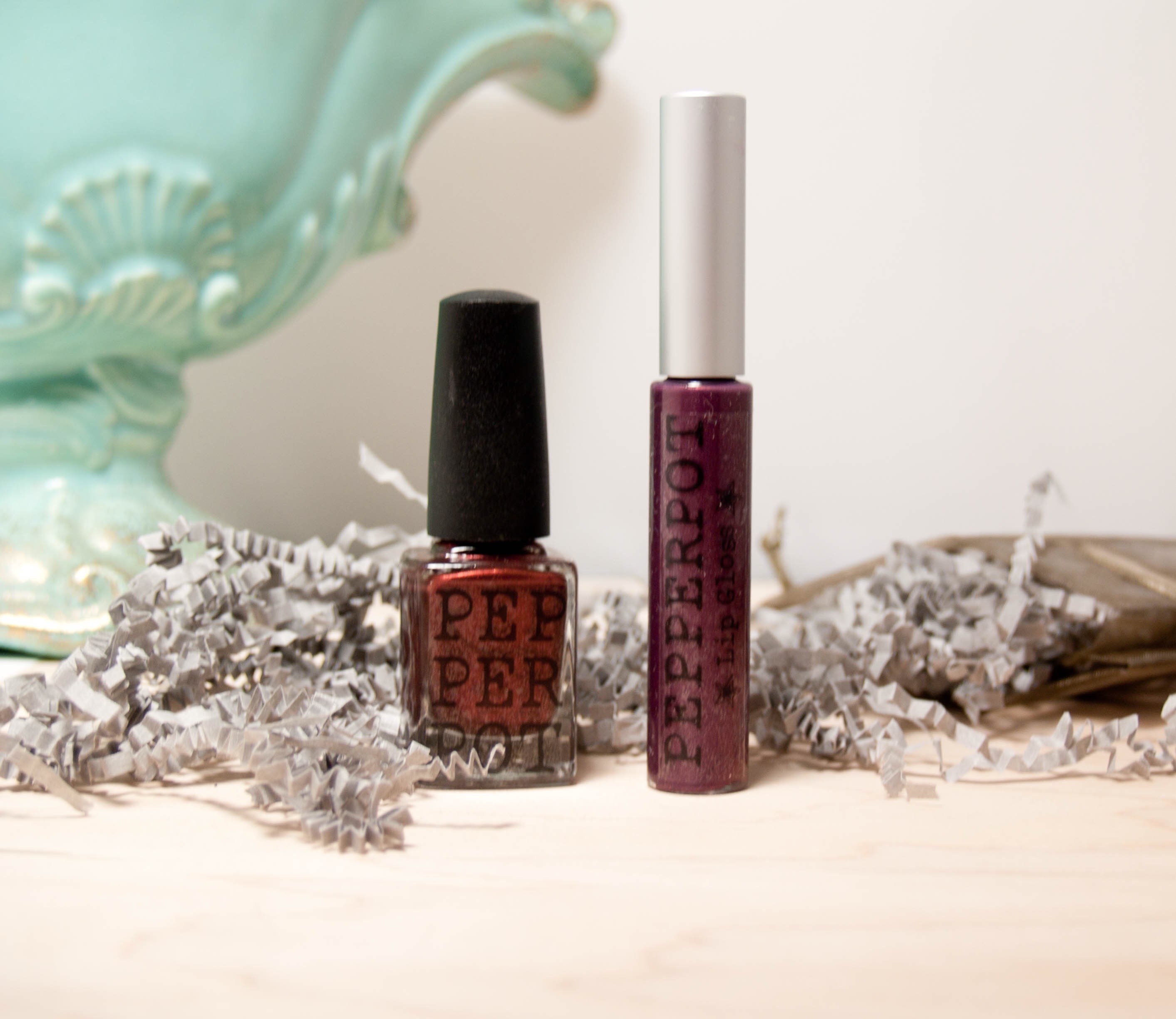 Bonus: until December 18th, every $50+ order will get an awesome free gift! The gift is “Feeling Naughty,” a sparkly chocolateley red polish (think chocolate covered maraschino cherries) and a cabernet-colored deep plum lip gloss with a hit of sparkle. I wonder if “Feelin’ Naughty” is some sassy counterpart to “Feelin’ Nice?” Mmmmm. Both of the free gifts are wrapped up in an organza bag (great for gifting…or keeping. I’m generally a big fan of keeping).