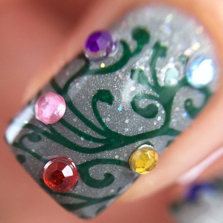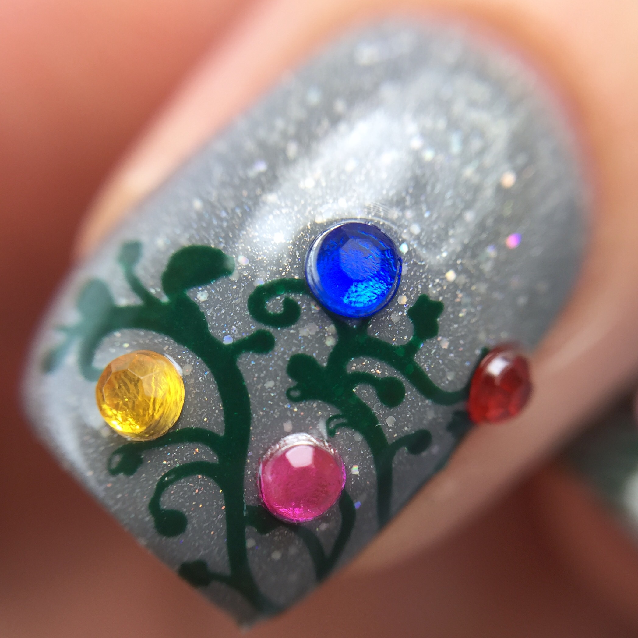 This is my contribution to Challenge Your Nail Art’s 12 Days of Christmas Nail Art Challenge. The prompt was “Christmas Trees,”  but since I have a problem following instructions, I only did a single tree. But I still like it!
