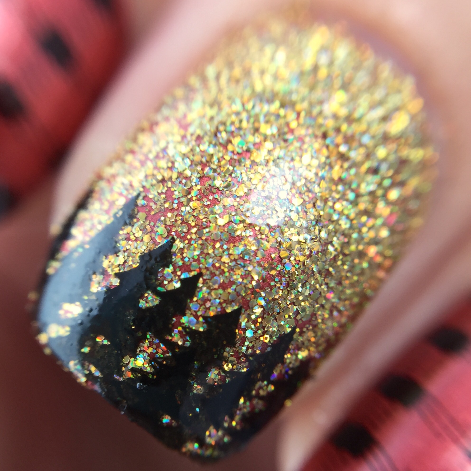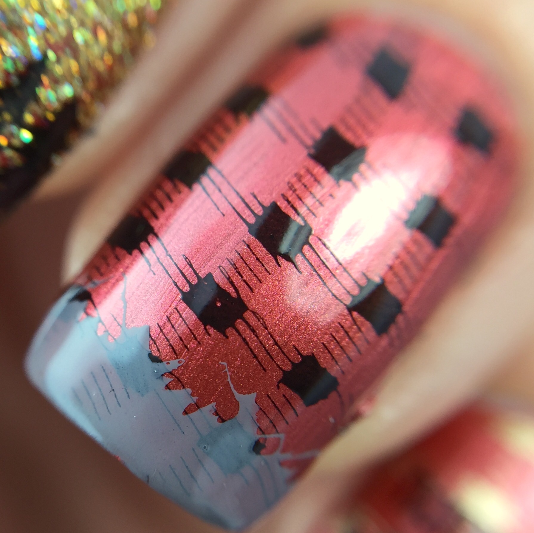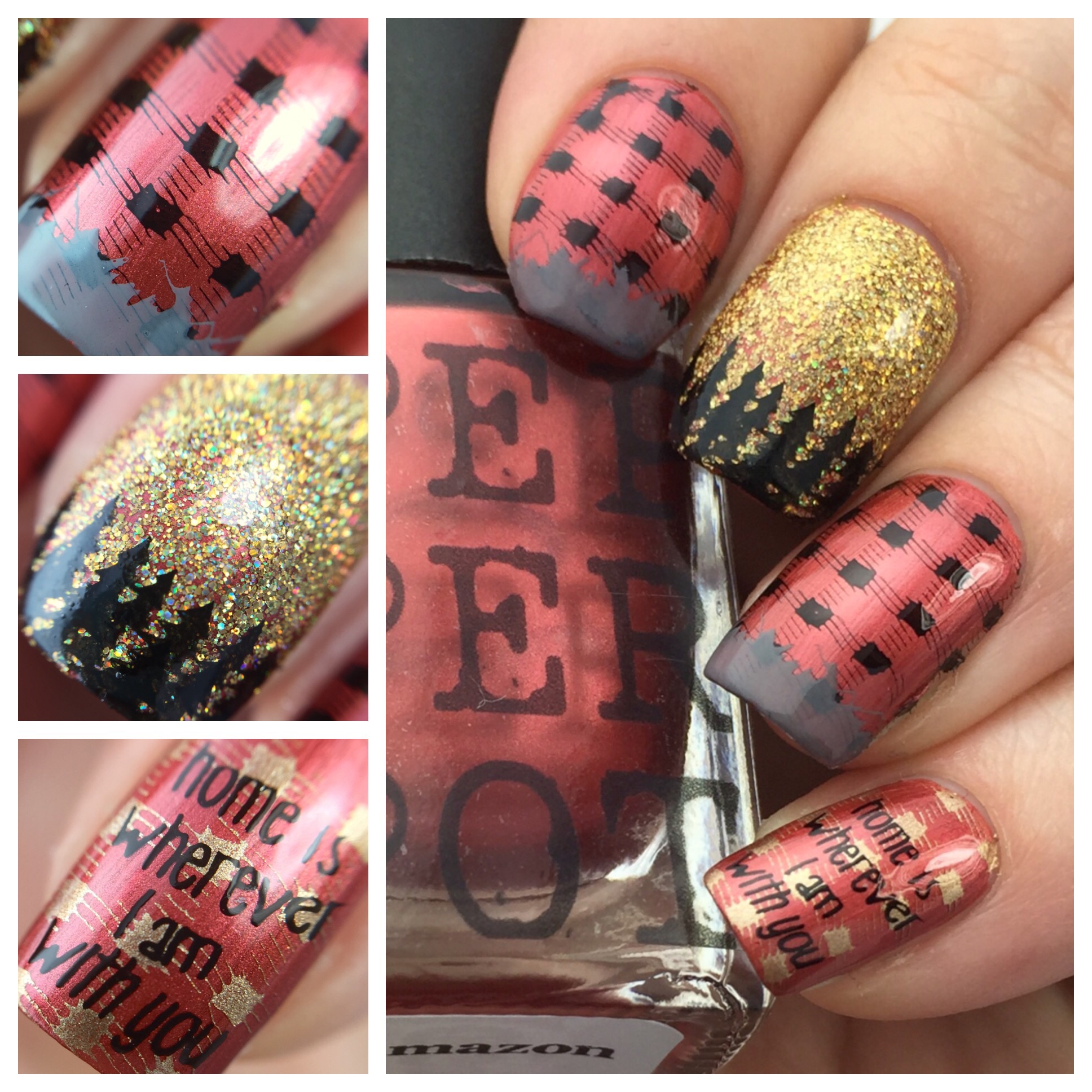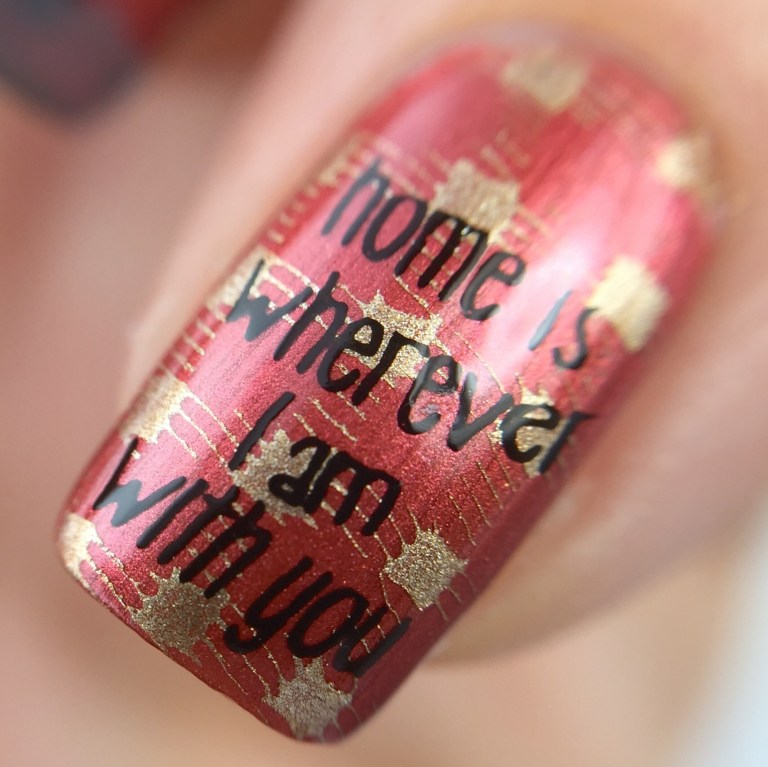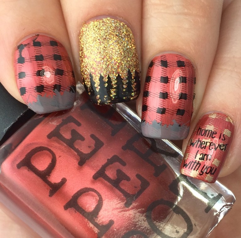 I used Pepper Pot Polish “Glamazon” (reviewed here) as the base for the look. Since the metallic brick red screamed “flannel” to me, I added a buffalo plaid design over top using Uber Chic Collection 2-02 and Bundle Monster black stamping polish. Over that, I used the same plate and MoYou London “Falcon” to stamp mountains on the tips (alpine French tips?). For the accent I used KBShimmer “Sun and Games” for the gold glitter and the same plate for the trees. It wouldn’t be Washigton without the forest!