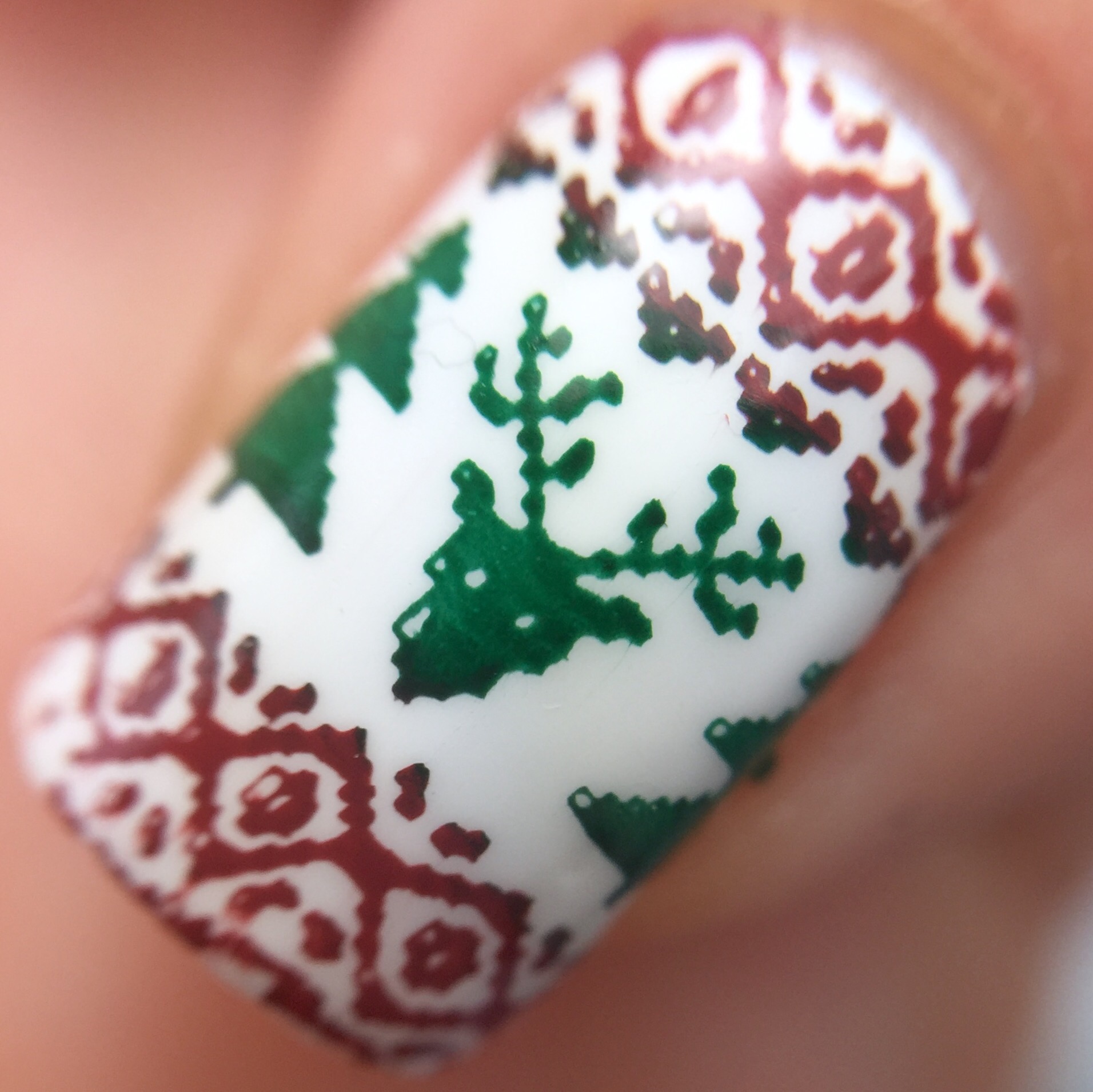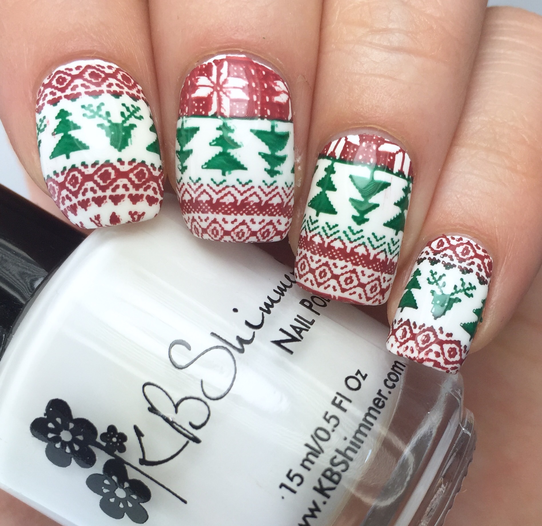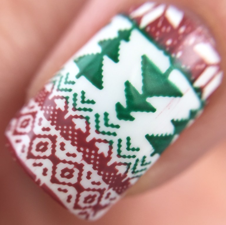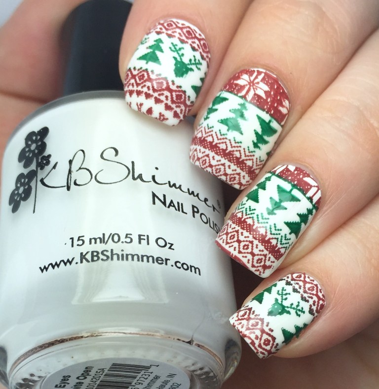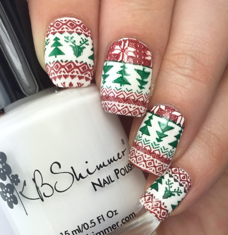 So for this look, I started out with two coats of KBShimmer’s “Eyes White Open” and then top coated with Love, Angeline’s new to coat “Topped With Love.”  (Reviewed here.) Then I used Uber Chic’s Christmas-01 plate, MoYou London’s “Maroon” stamping polish and Painted Polish’s “Woodland Whimsy,” which stamps like a dream. (Reviewed here in non-stamping usage.)