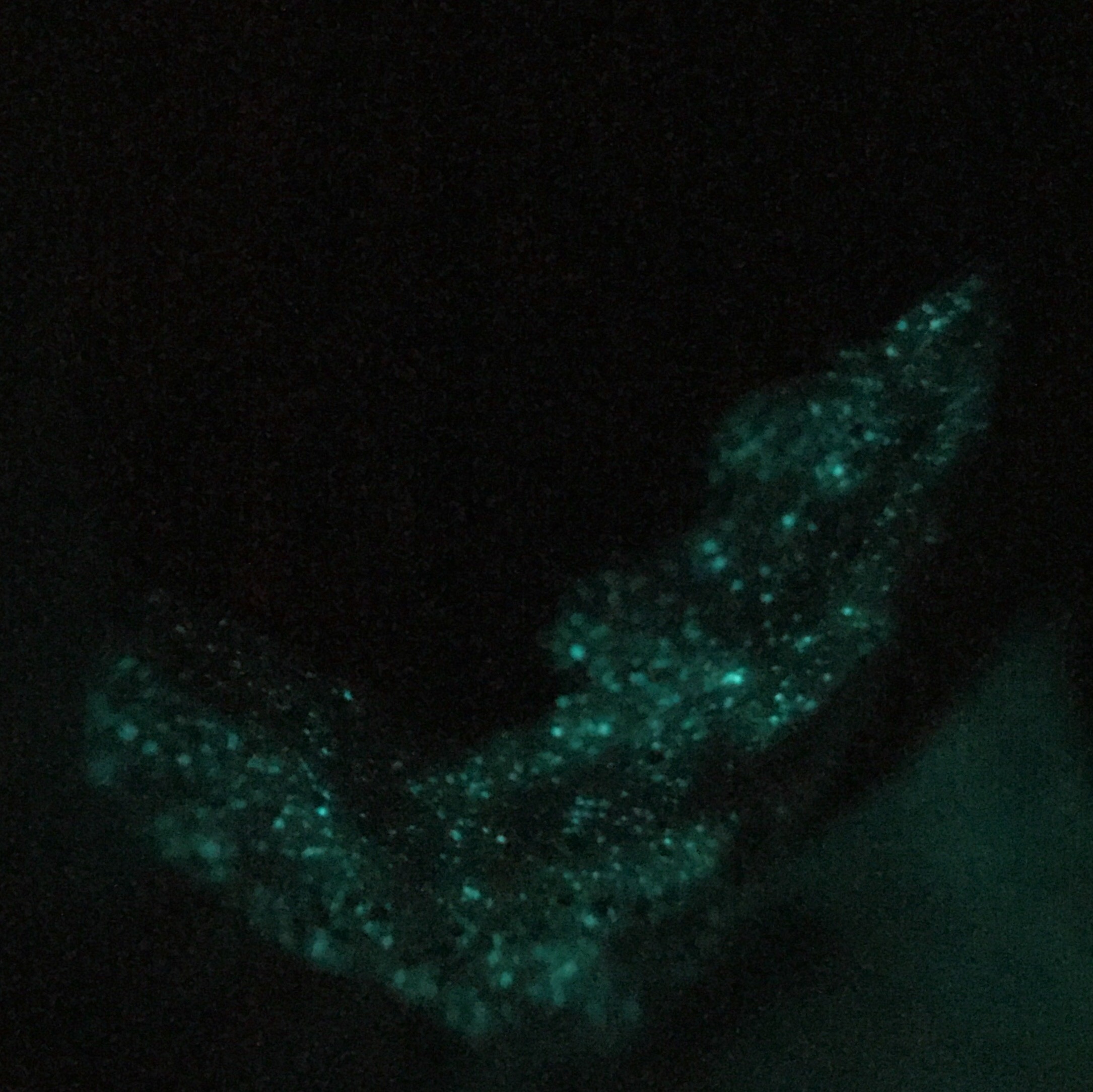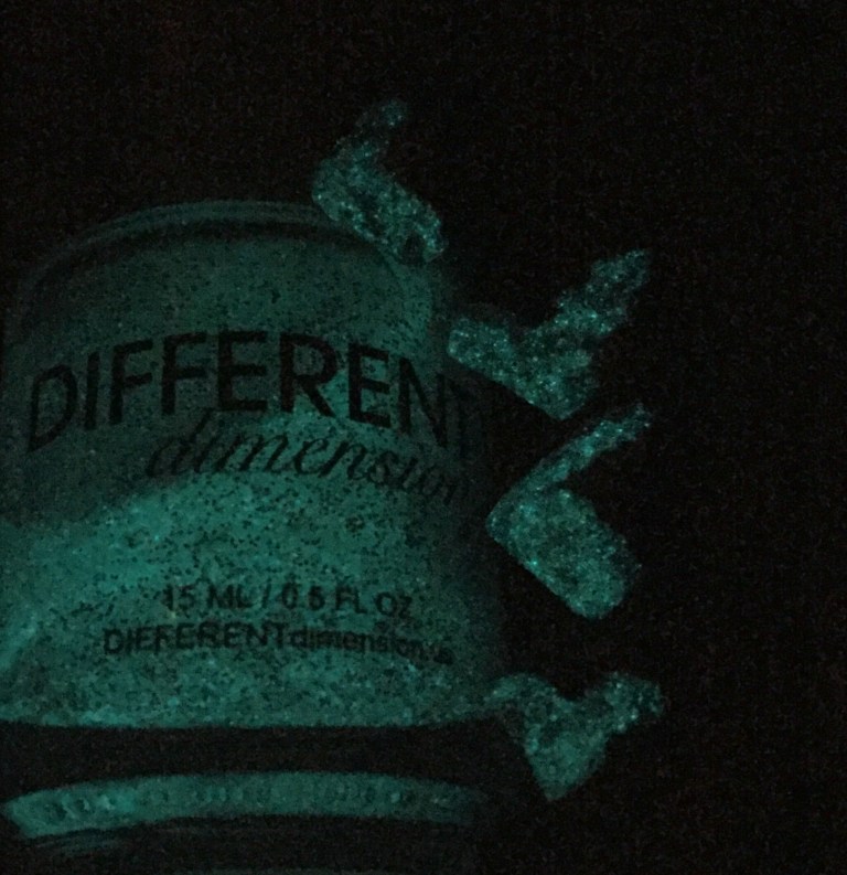 I was a bit disappointed in how globby the acrylic paint looked, so I decided to keep adding on. (More is more!) To spice things up, I added some Different Dimension “Imitation is the Most Sincerest Form of Flattery,” a silver glitter glow-in-the-dark topper. I figured that it went with the snowy landscape theme, since real snow sort of glows in the moonlight at night. In keeping with the theme, I only painted this over the snowy acrylic paint, hoping that it would look really cool in the dark.