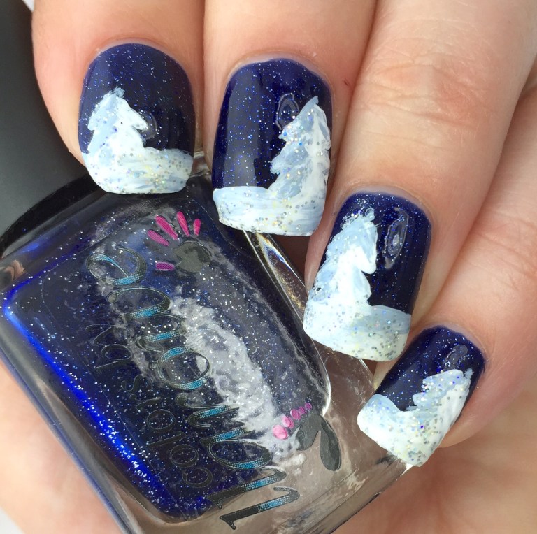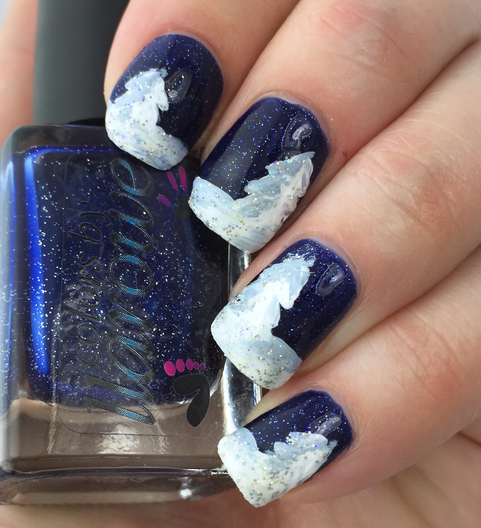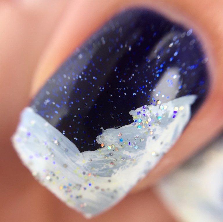 This mani is inspired by quiet snowy nights and wintry landscapes. I started off with two coats of Colors by Llarowe’s “Twinkle, Twinkle Little Star” (a dupe for the original Essie Starry, Starry Night). I love the glint of silver microglitter in the blue jelly. On top the dark blue background, I painted in a ground line and trees in shades of white and blue-gray acrylic paint. This is my first time using acrylic paint on my nails, and I’m not sure that acrylic paint is going to be my best bet for impressive nail art, but it was fun to experiment! Does anyone have any tips?