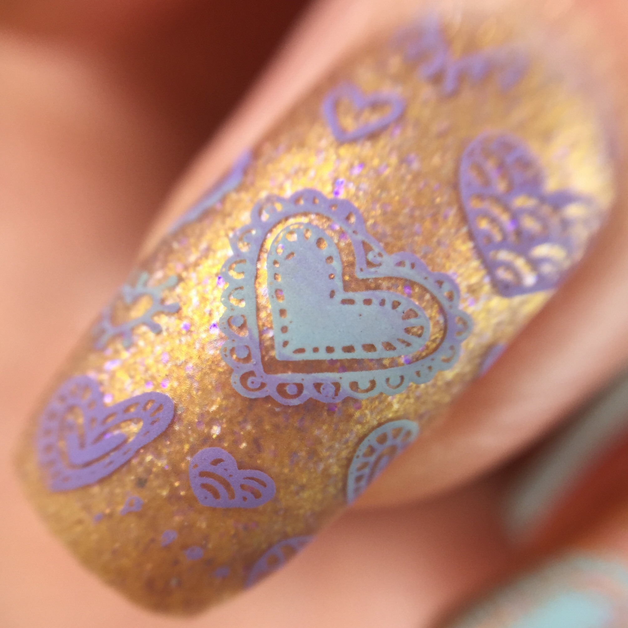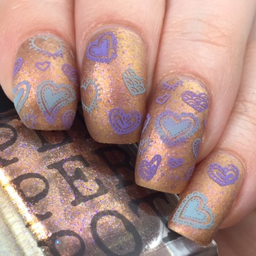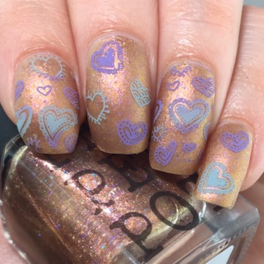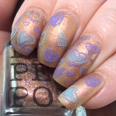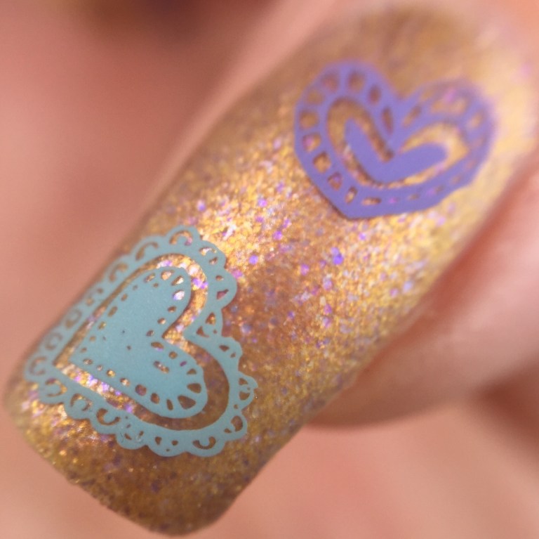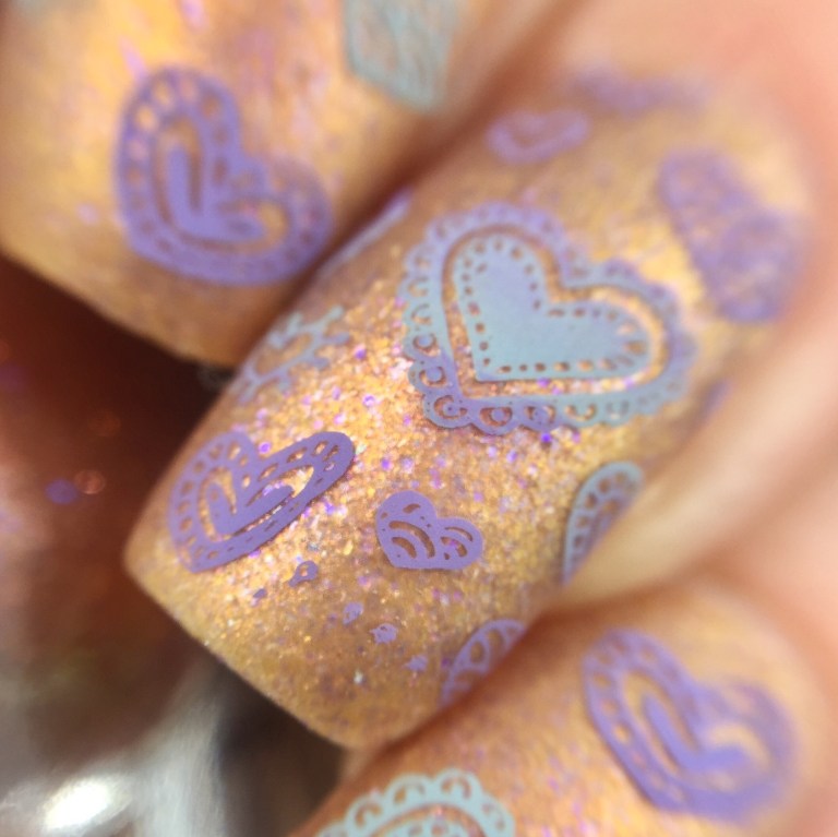 I started off with “Cats & Feminism 4Ever” (want to buy? used code “PHD2017” for 15% off) as the base and matted it with KBShimmer’s “Oh, Matte!” to tone down the metallic and bring out the lavender flakies. From there, I used both whole-nail and coordinating individual designs from UberChic’s Collection 7-01 to pattern in the cutesy hearts. I used two stamping polishes for this look: MoYou London’s “Dusty Cloud” and Dance Legend’s “Violet“. For the full-nail designs, I smooshed together the two colors before scraping, so that the colors came together in stripes.