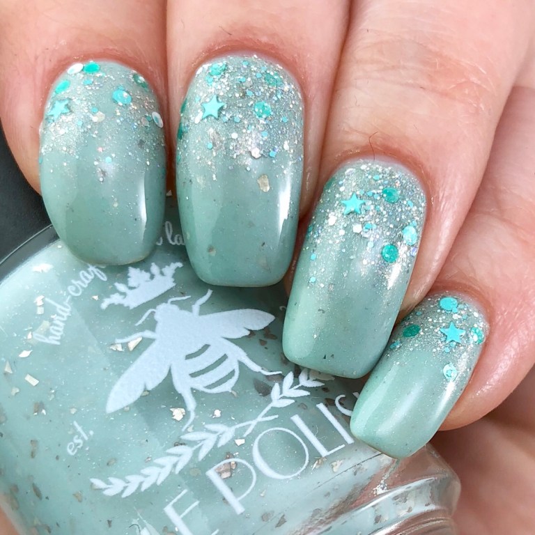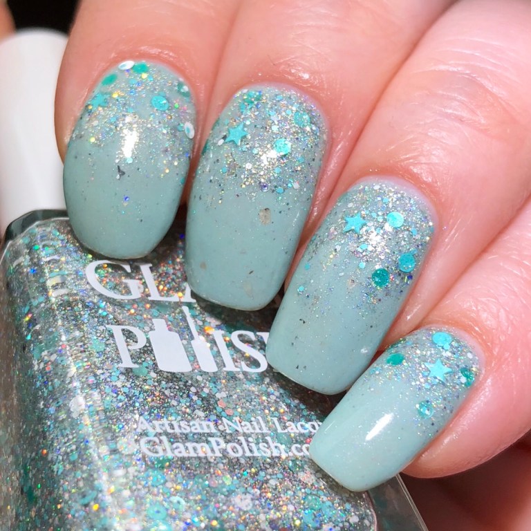 Over “Succulent Stargazer,” I’m using Glam Polish “Wheeeeee!” as a topper. The base for this polish is just silvery holo particles in a clear base, so it works well on it’s own as well. For this look, I dabbed a bit on at the base of my nails, scraped all the polish off the brush, and then brushed down from my base to create an ombre effect. When I was satisfied that the holo was distributed properly, I went back and poked around in the bottle for some more fun glitter and added that. If there’s stars in the bottle, I’m sure as heck going to make sure there’s precisely one per each of my nails.
