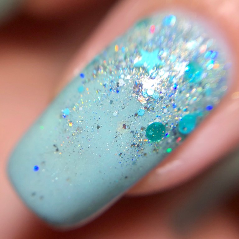 For you enjoyment, I’ve taken the pictures in a couple of different lights, so you can see how the holo looks in different scenarios. I’ve tried to color correct as much as possible, but this is just one of those blue-green-mint-turquoise shades that truly does transform under different light conditions.