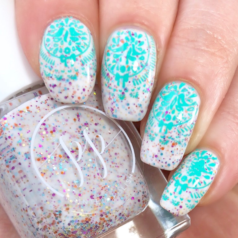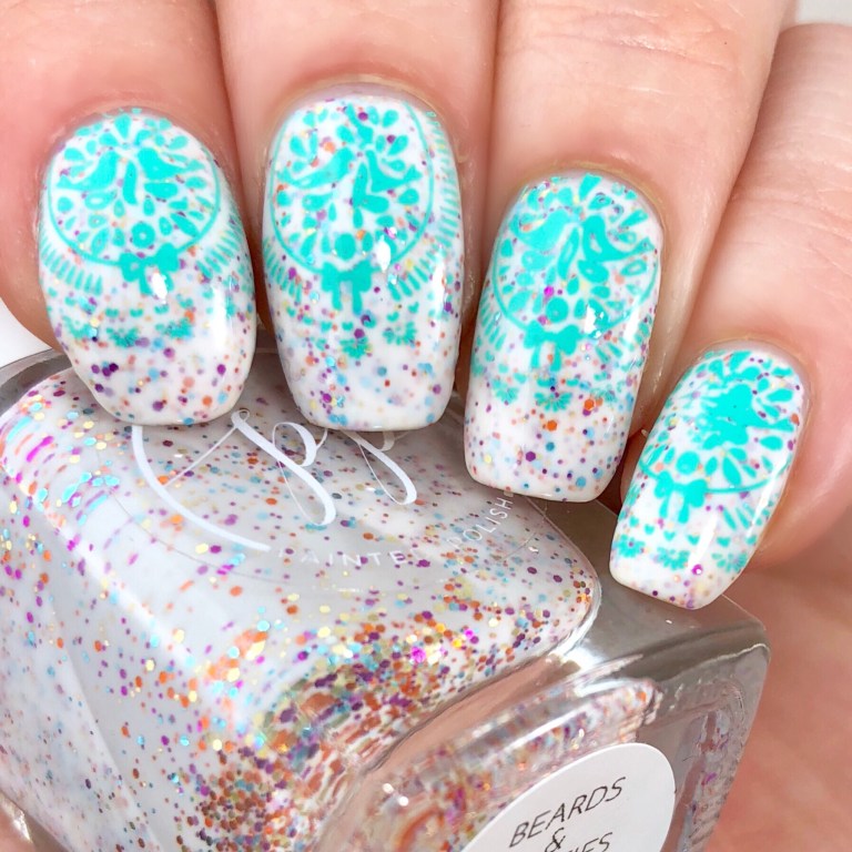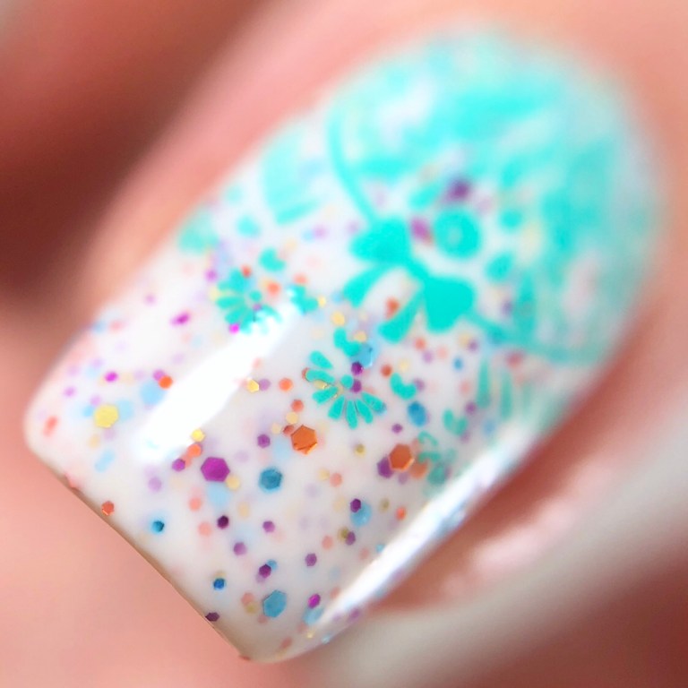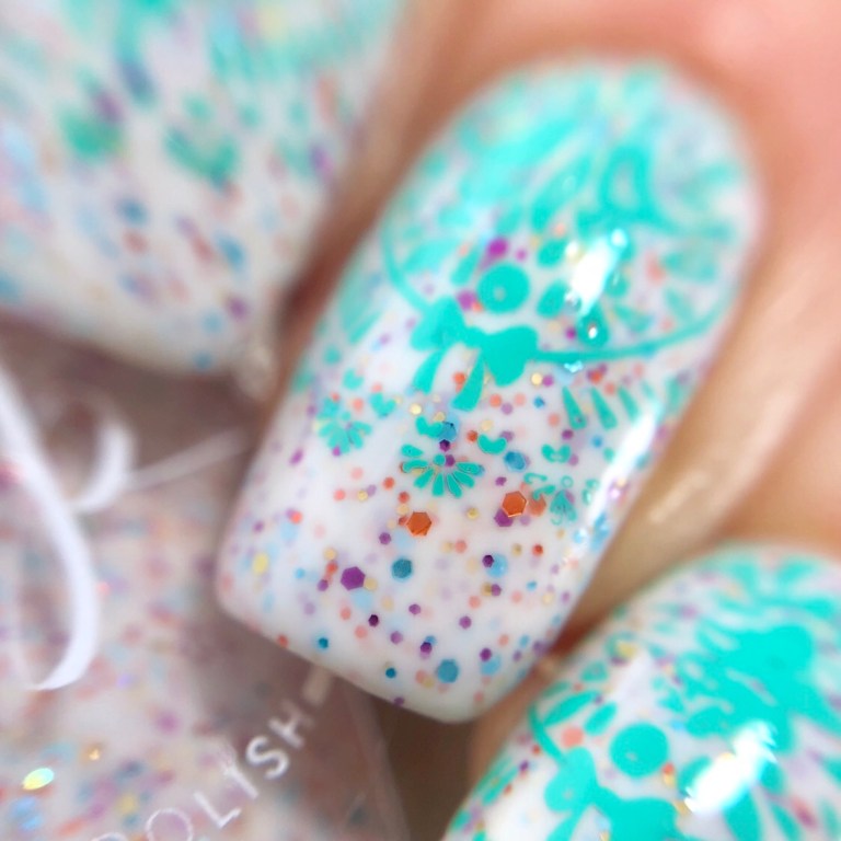 Over the glittery based, I stamped a folksy springtime pattern (with tiny bows- to tie back in with the polish name!) using Dance Legend stamping polish in Mint and MoYou London’s Festive 24 stamping plate.